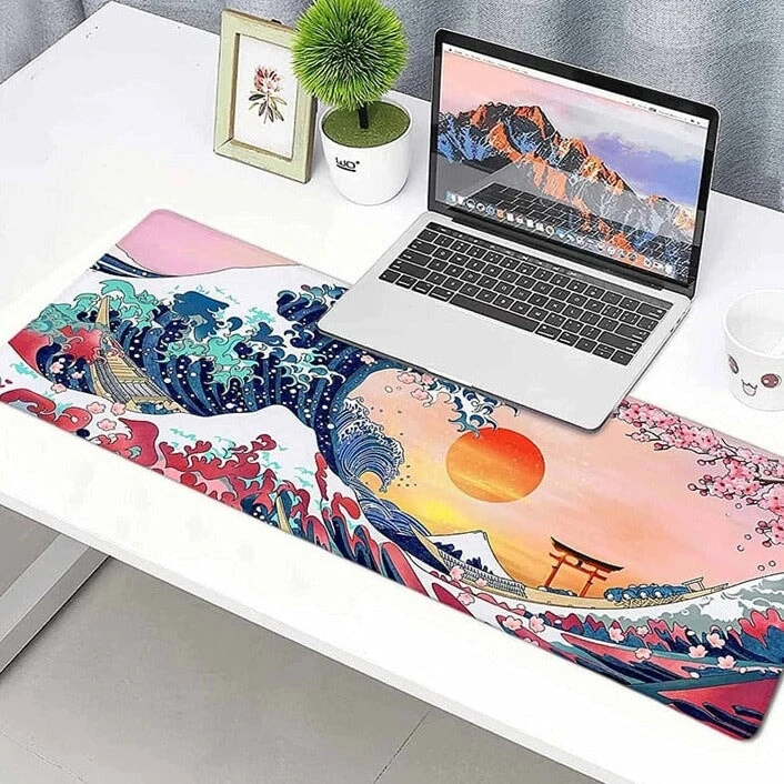 Feeling bored or tired of your desk? Switch it up with this long mouse pad and feel like you are working or playing in a completely different environment. More than double the size of your average mouse pad, these amazing detailed artistic mouse pads would make the perfect gift for anyone who loves Japanese Culture. Featuring the Great Wave of Kanagawa art with a sunset background and vibrant colors. A 2mm thick mat means it’s better quality.