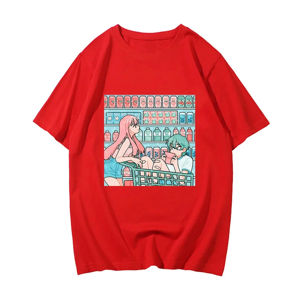 Look no further! This is the perfect top for anime lovers showcasing a pastel illustration of a coupe shopping in the drinks aisle. A lightweight classic tee that effortlessly adds a kawaii flair to your daily routine.