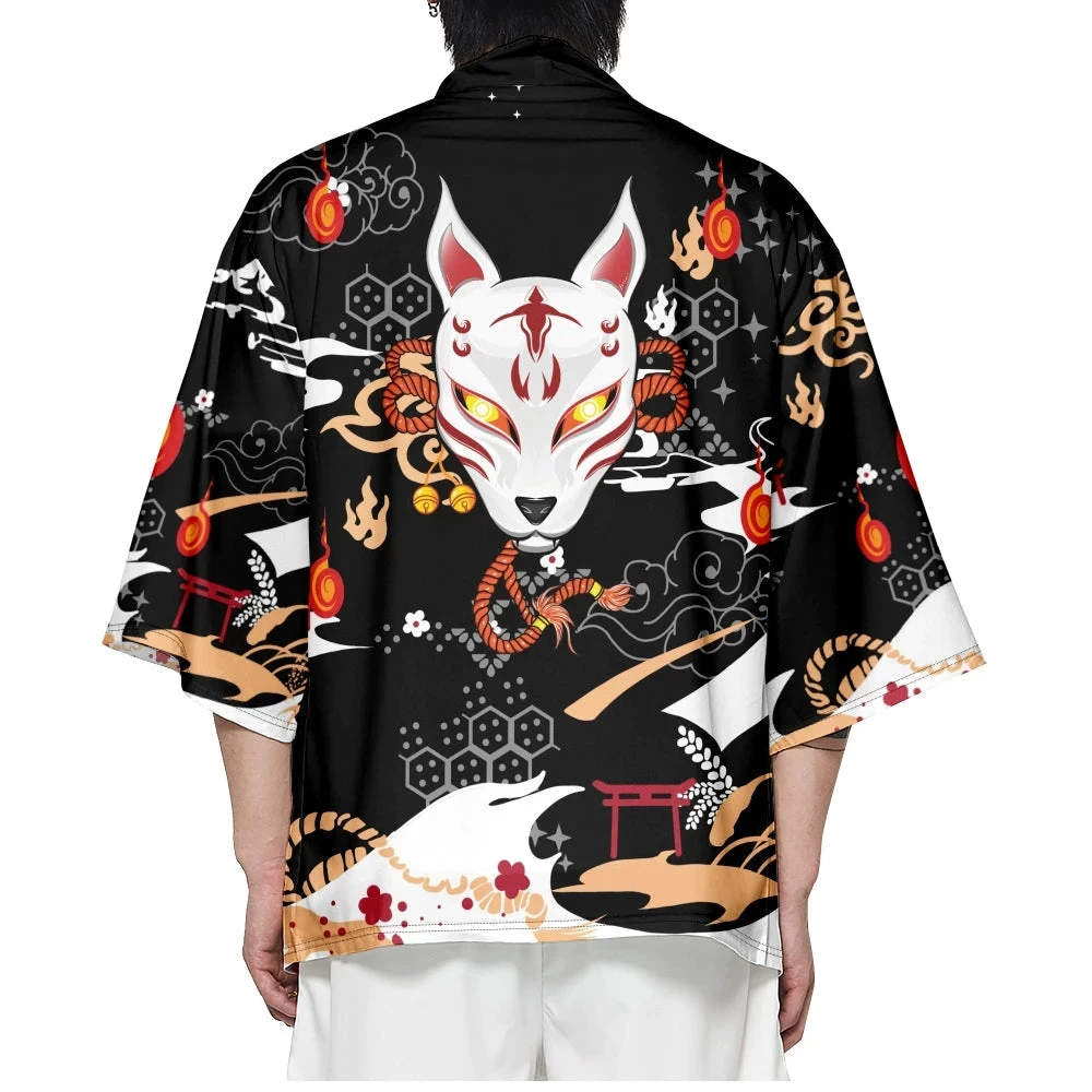 Picture yourself walking down the street in the soft embrace of this kimono, a canvas adorned with an awesome illustration of a Japanese-themed white fox mask and a complex pattern against a black canvas. A story of ancient legends and modern elegance combined, invoking the spirit of the mythical creature said to bring fortune and transformation.