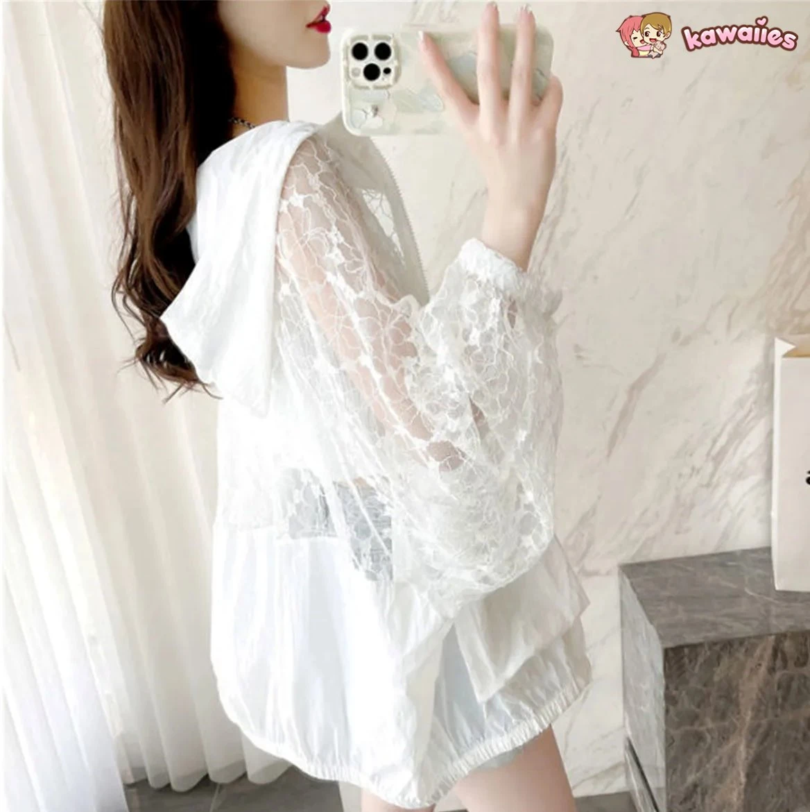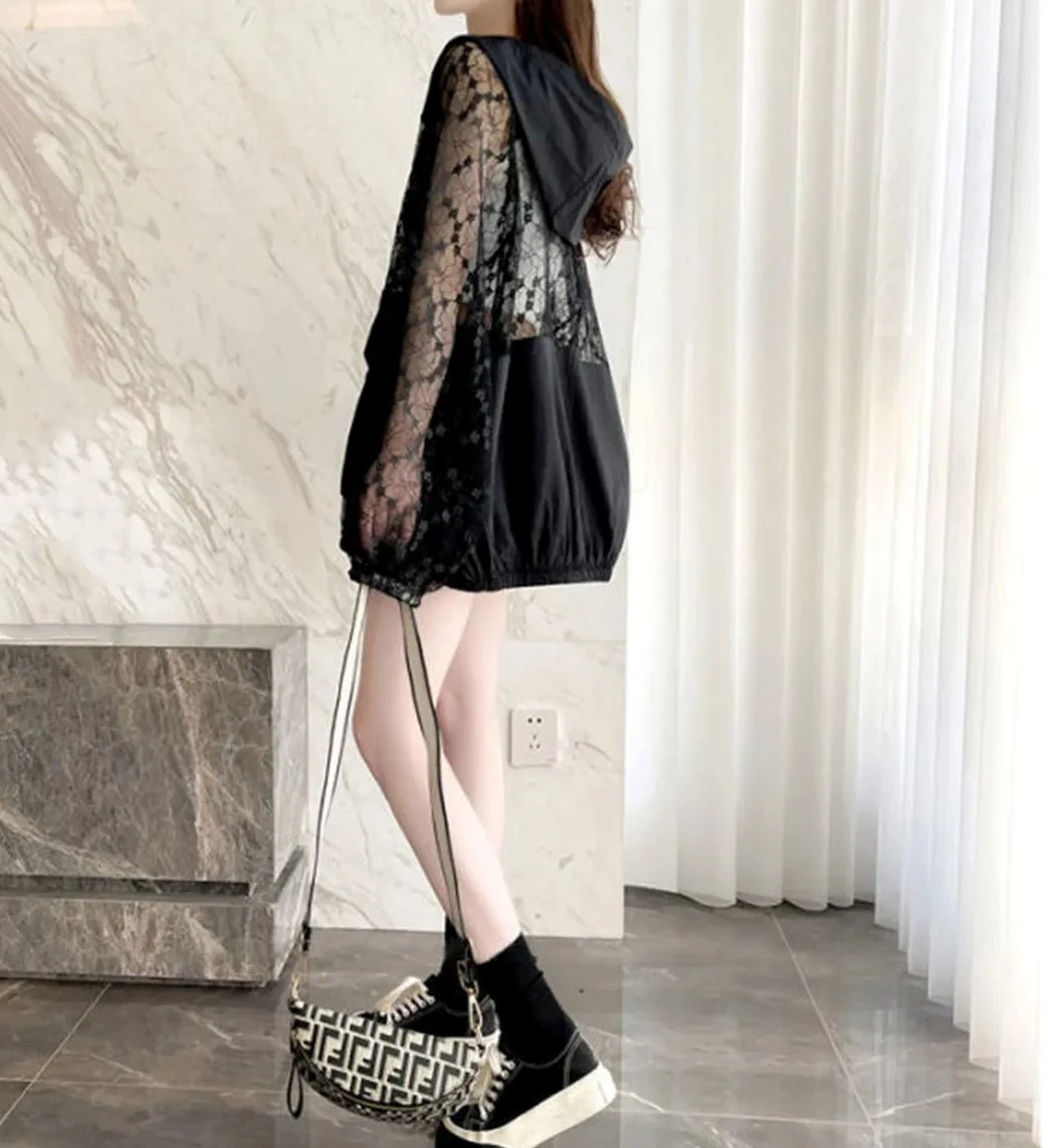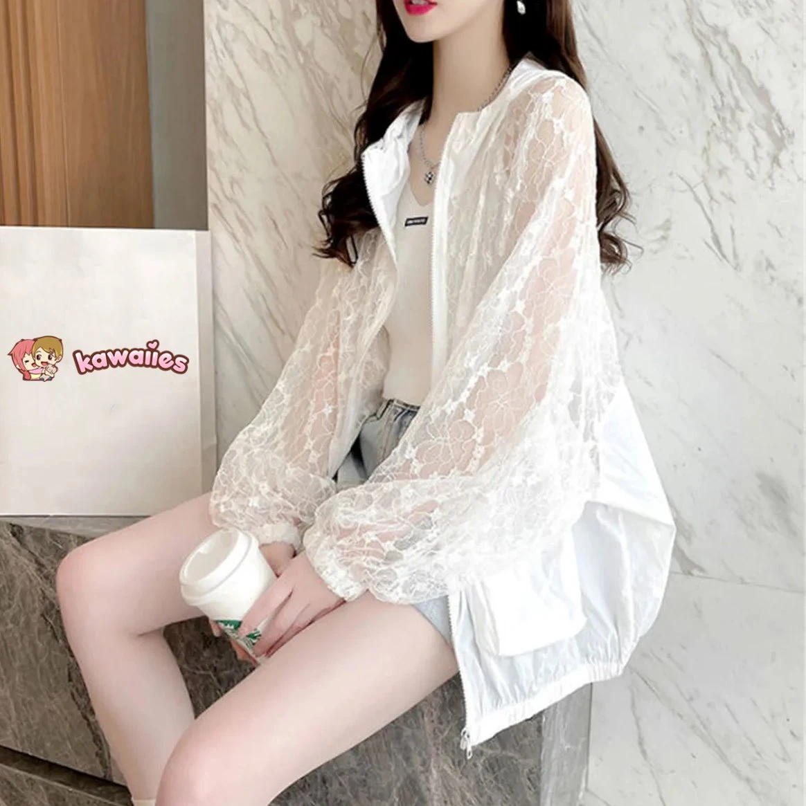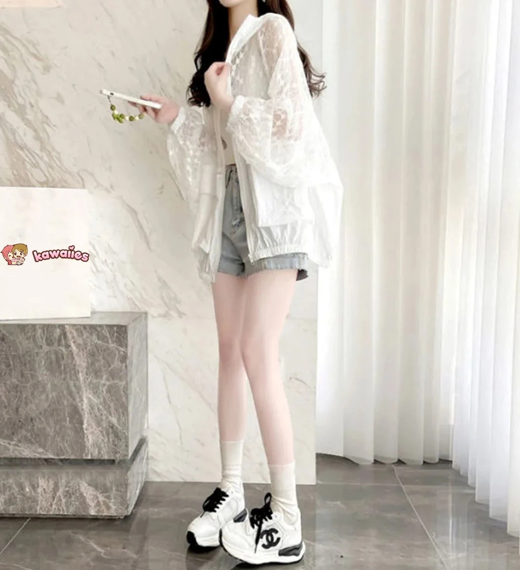 Add this to your wardrobe featuring a half-laced hooded jacket that will sit lightly on your body. Enjoy wearing this long-sleeved jacket when you’re out with friends! Pair it effortlessly with jeans or shorts and a cute top. Be prepared to stand out with a jacket like no other!