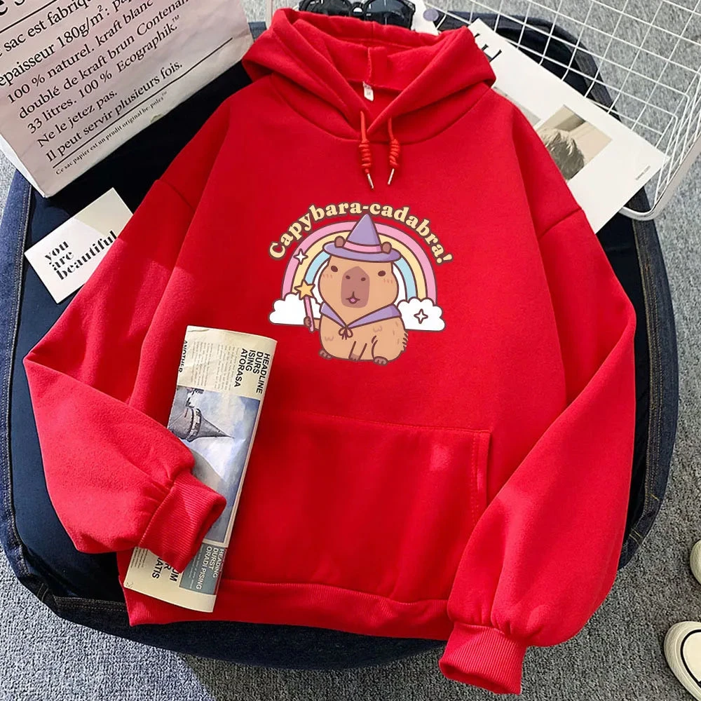 Add a touch of kawaii style to your wardrobe and revel in the delightful warmth with this unisex hoodie featuring a kawaii capybara in a magician outfit with a rainbow behind it with the words ‘Capybara-cadabra!’.