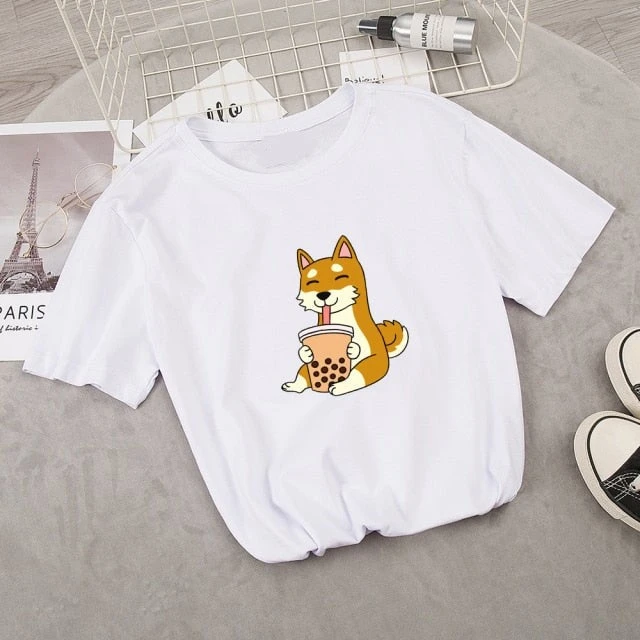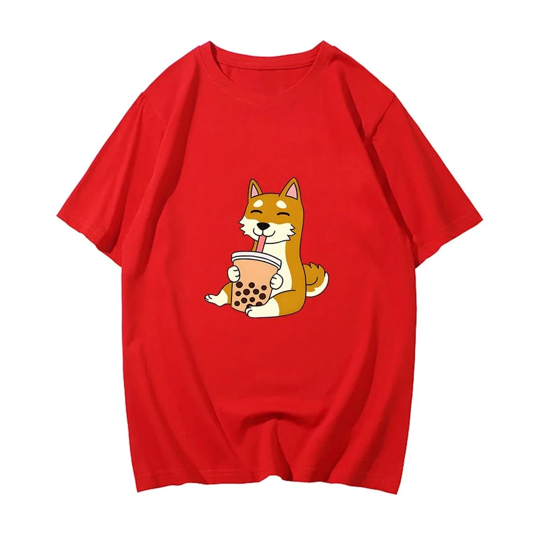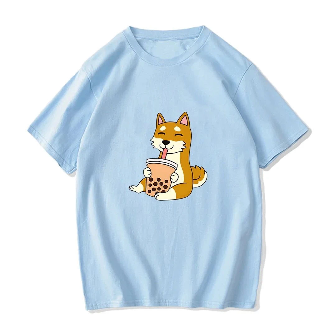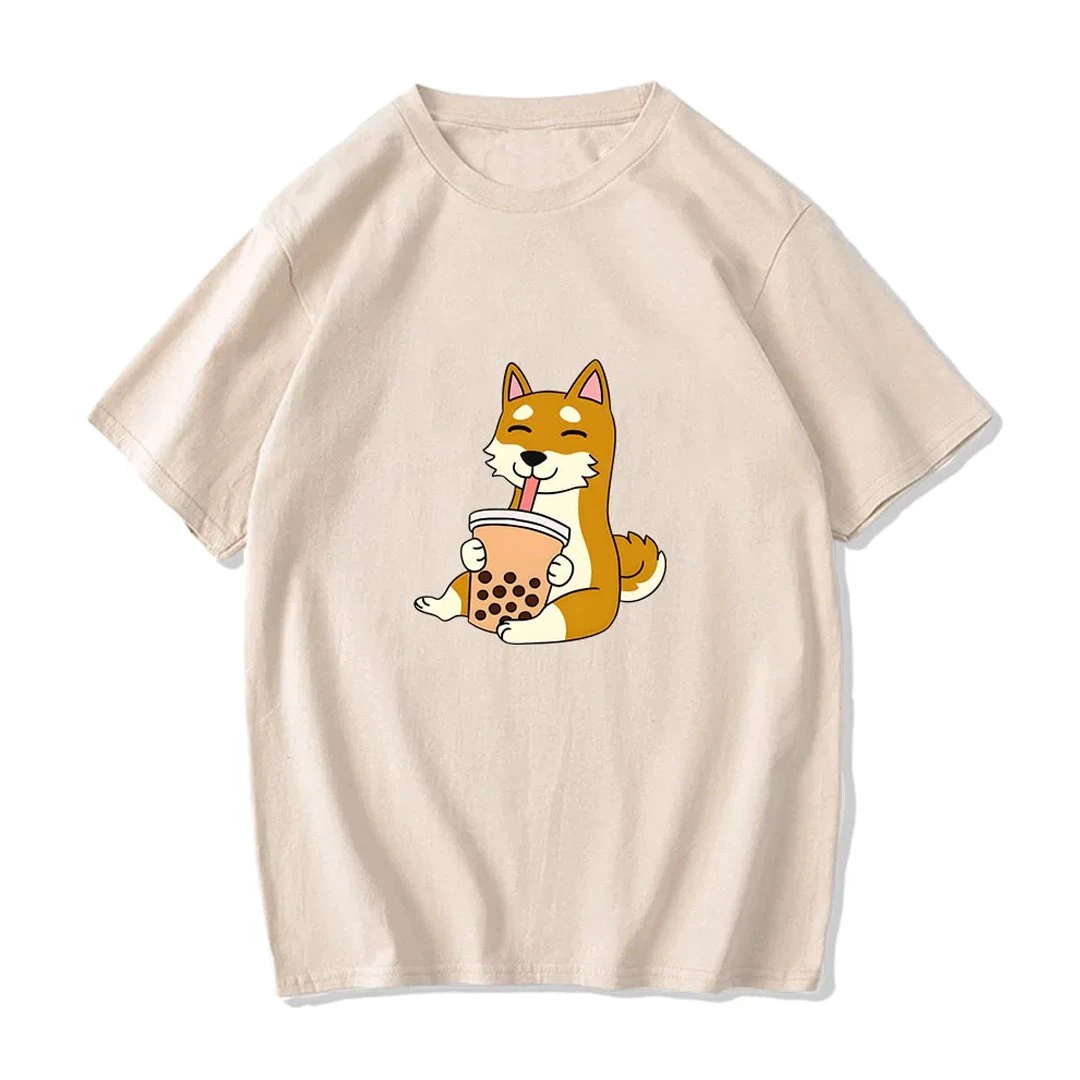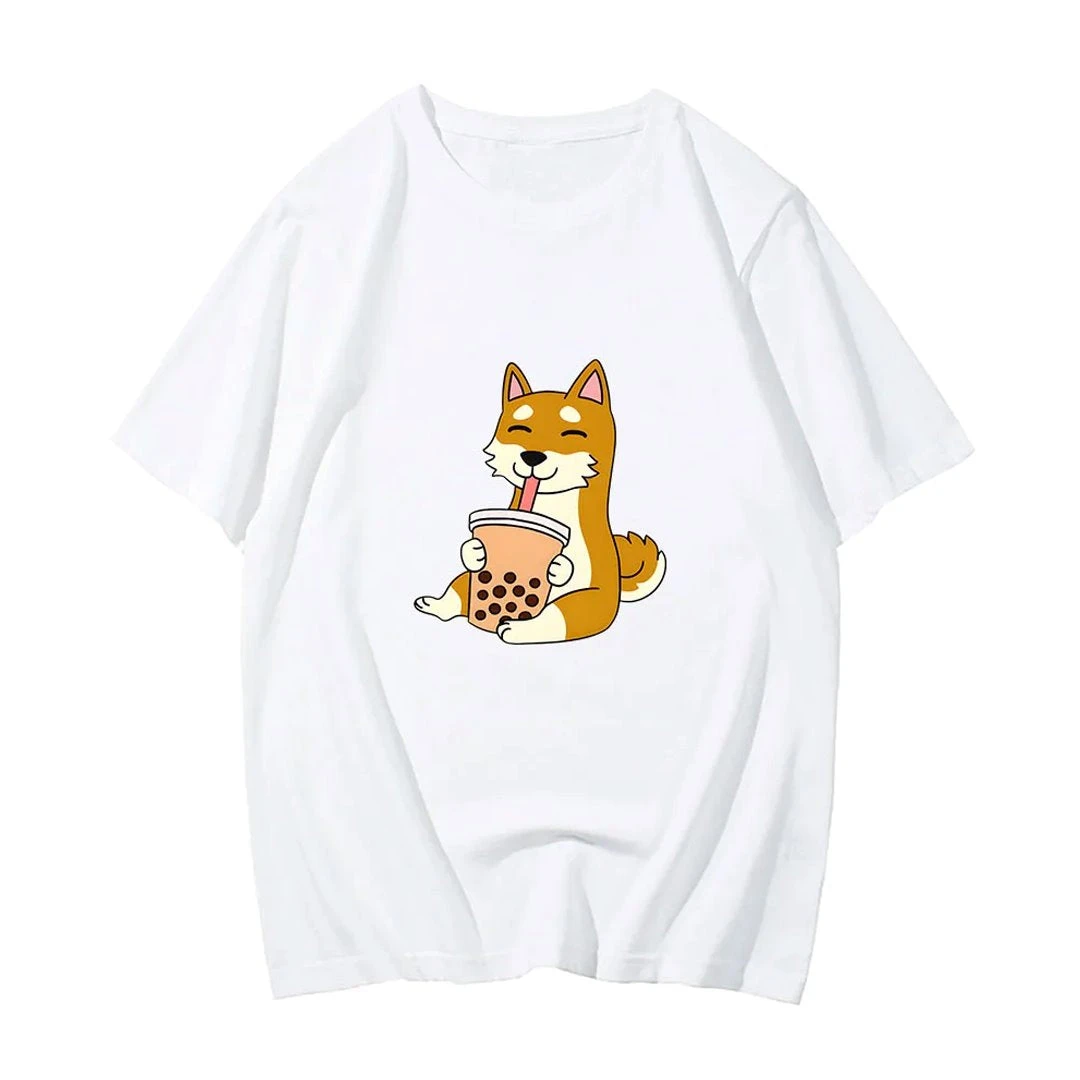 Apparel Cartoon Shiba Inu Drinking Bubble Tea Women’s Part Cotton Tee