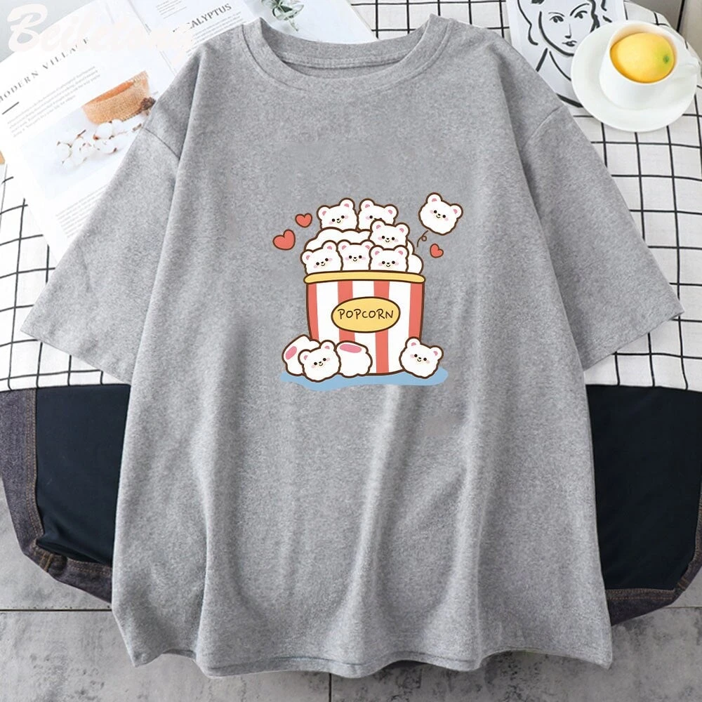 Indulge in the perfect blend of comfort and cuteness with this tee, made from a luxurious Cotton Modal blend that feels as soft as a cloud. Capturing the essence of kawaii charm featuring sweet white bears sharing a magical moment over popcorn.