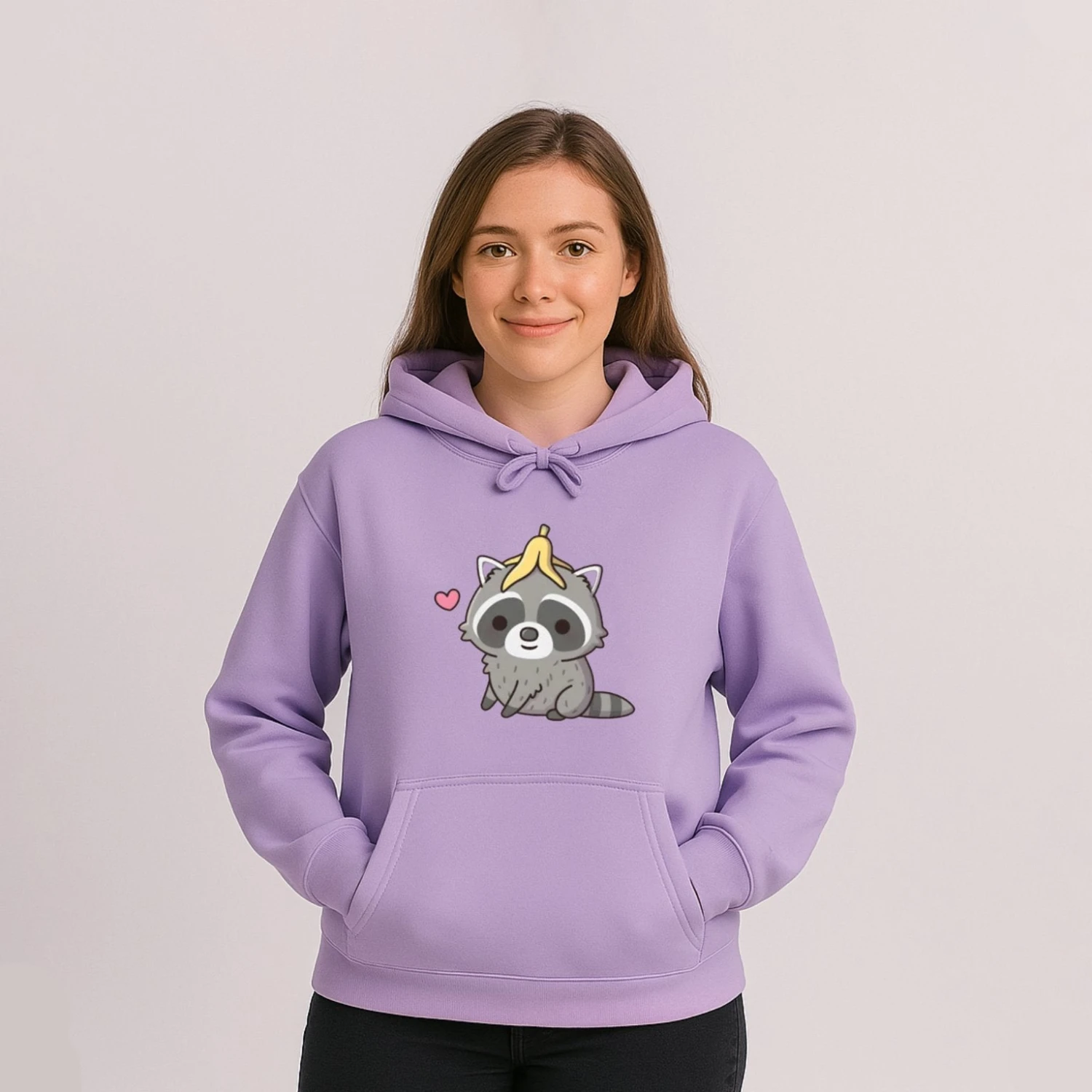 Step into the spotlight with a touch of style and revel in the delightful warmth provided by this unisex hoodie featuring a cute raccoon with a banana on its head.