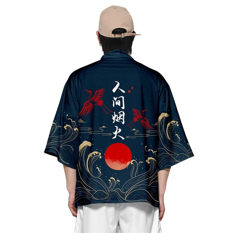 Imagine a canvas of a deep navy kimono, adorned with the majestic silhouette of cranes soaring against the backdrop of a blood-red sun. The imagery captures the essence of Japan’s mystique, where tradition and modernity blend seamlessly. Every detail resonates with significance, inviting you to become a part of this beautiful design.