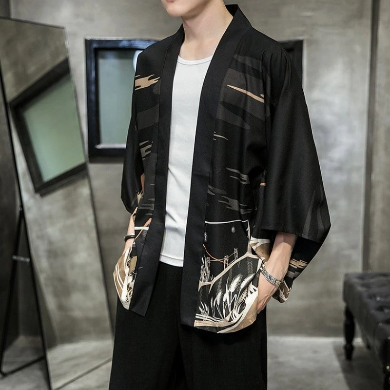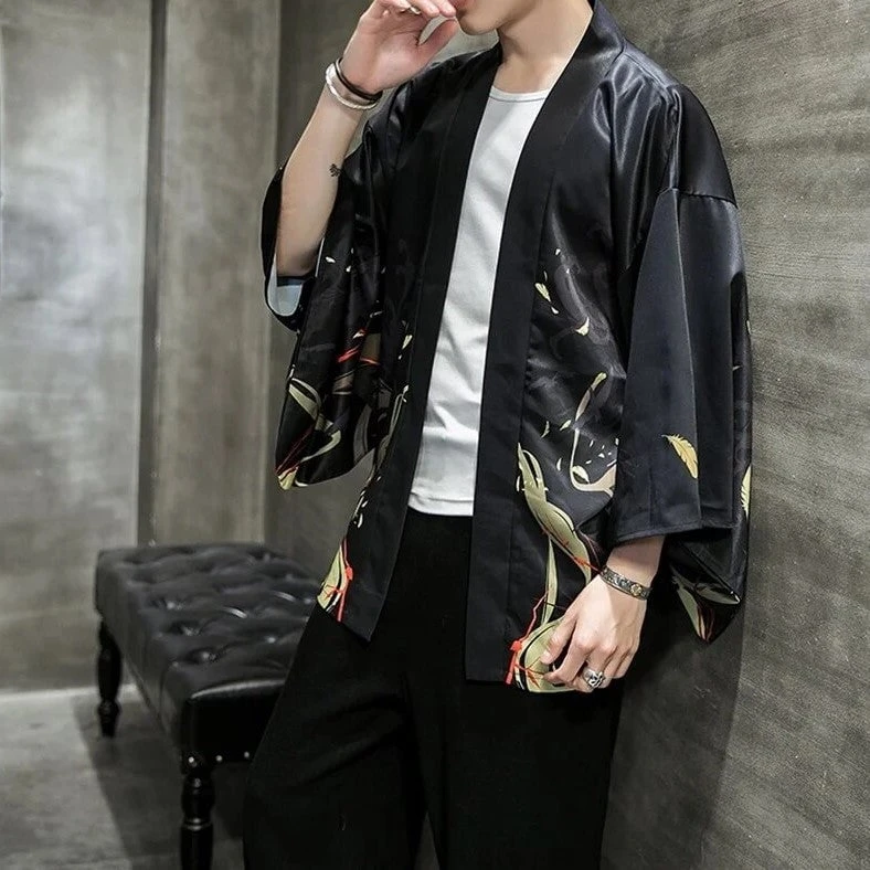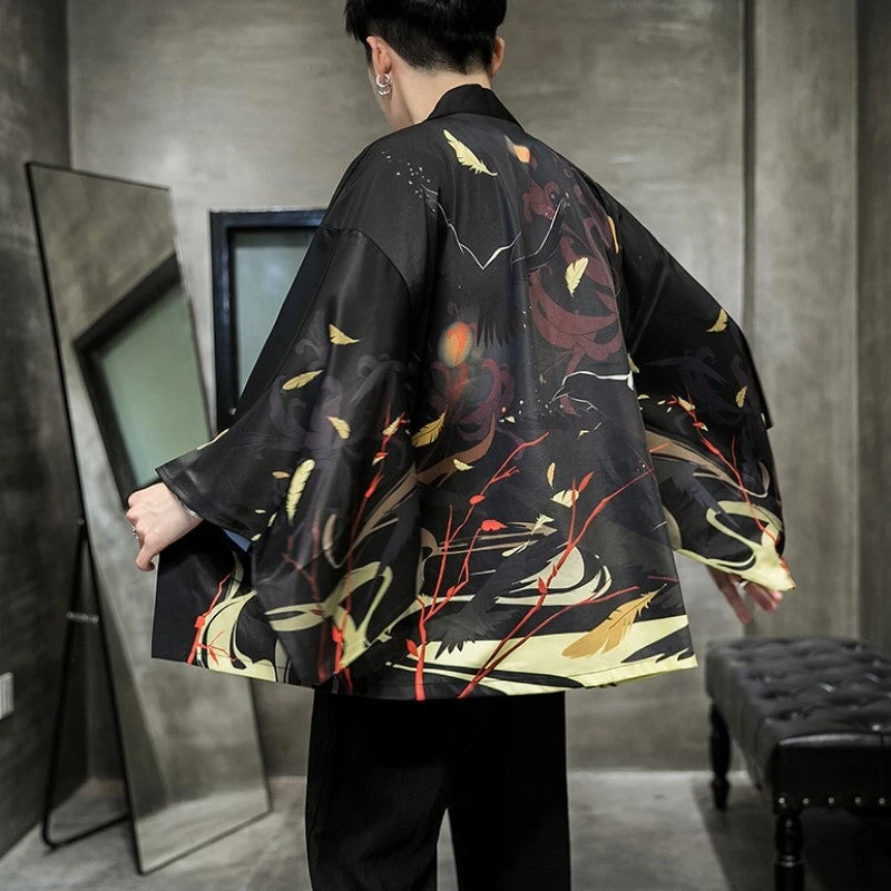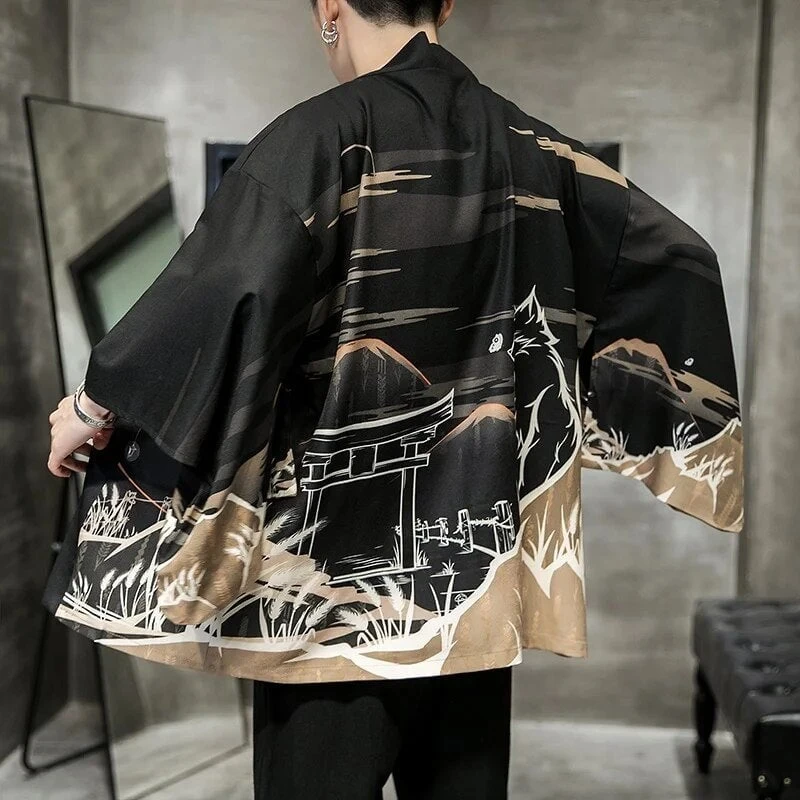 The kimono features a vibrant pattern of golden leaves, branches and flowers that contrast with the dark background. The kimono also has a misty torii print on the back, which is a traditional Japanese Torii means passing through the torii, you are entering the realm of the gods. The kimono is a perfect choice for anyone who wants to express their appreciation for the beauty and culture of Japan. The kimono is suitable for various occasions, such as festivals, ceremonies, parties or casual wear.