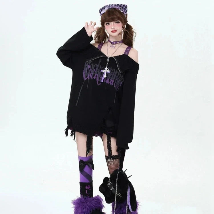 Enter your gothic era — cute, cursed, and totally unforgettable. The Off-Shoulder Sweater is where gothic streetwear meets kawaii rebellion. With a distressed hem, oversized fit, and dramatic graphic front and centre, this sweater drips with punk energy.