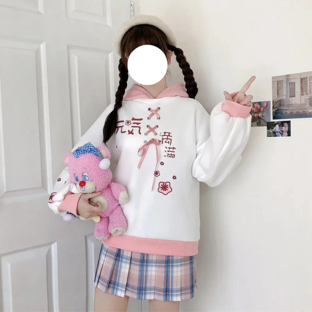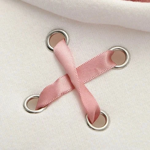 Experience the ultimate coziness with these thick candy floss-themed hoodies, perfect for pairing with a kawaii skirt, leggings, and boots for a Harajuku look. Whether you’re chilling at home or going into the city with your besties, these are the perfect hoodies. Featuring printed sakura petals, kanji text and a criss-cross lace design on the front with a two-tone colourway.
