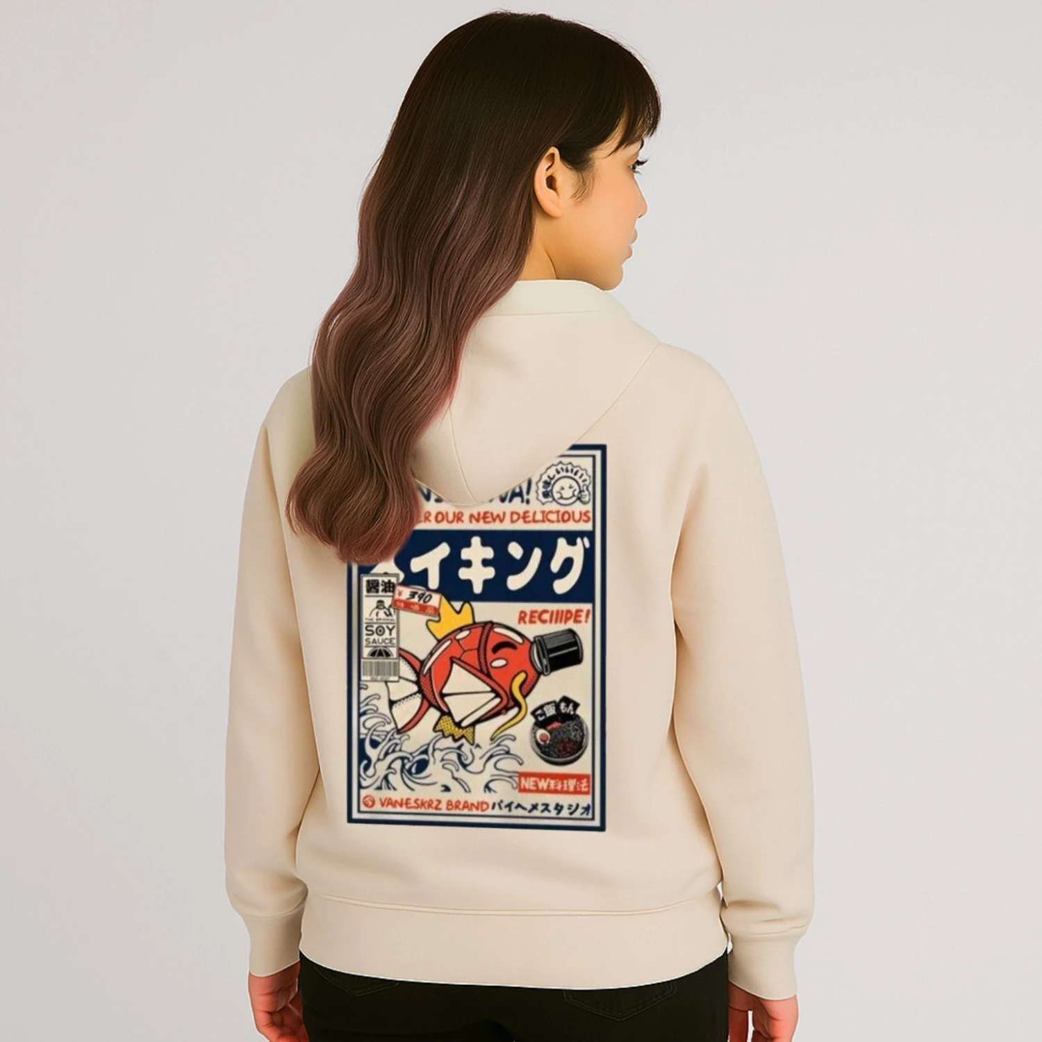Then you don’t want to miss out on this awesome Japanese-themed hoodie featuring an illustration of a fish poster on the back and a fish icon on the front. With a classic look, this high-quality tee is great to add some fun to your wardrobe. Each hoodie is sold separately.