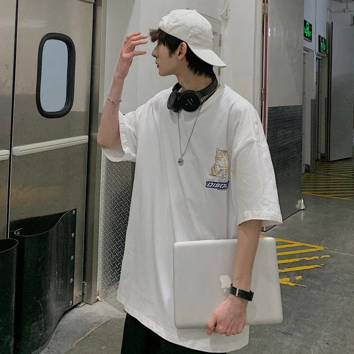 Then this short-sleeve oversized tee is a must-have for you! Features a cool cat slurping on noodles with Japanese letters printed onto the back with a small cat illustration on the front. With a classic oversized look, this light, thin tee is going to make you stand out from the crowd.
