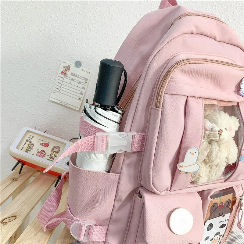 This functional and kawaii backpack feature several compartments on the inside and outside, buckle straps, and cute accessories to add a touch of personality to your style. The front of the bag also features a cute see-through pocket where you can keep things safe or show off your small plushies! Made from high-quality waterproof materials with enough space to fit all of your studying necessities.