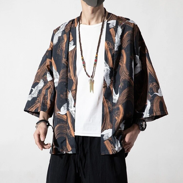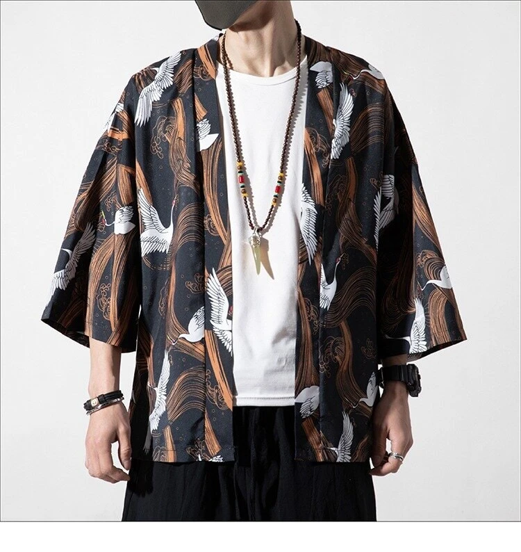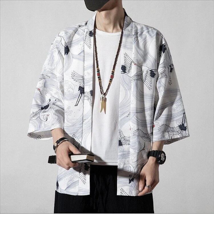 A stunning summer wear, the Japanese Royal Cranes Kimono features a beautiful design of royal cranes in flight. adding an air of elegance to any look. Its light, breathable fabric will keep you cool while looking your best.