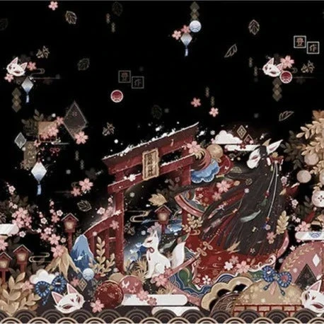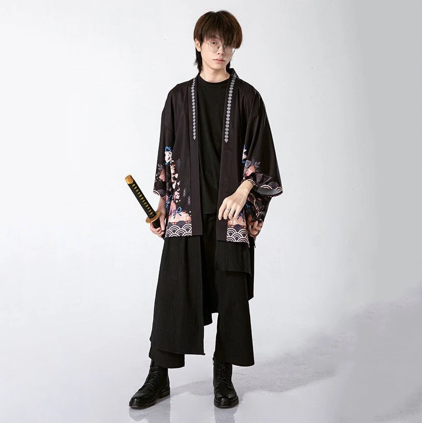 Slip into an affordable kimono that feels soft on the skin with a touch of Japanese style. Choose between two designs featuring a black and dark green canvas with shrines and cherry blossoms with a unique pattern around the collar. A classic loose fit that feels light and silky soft all day long.Â