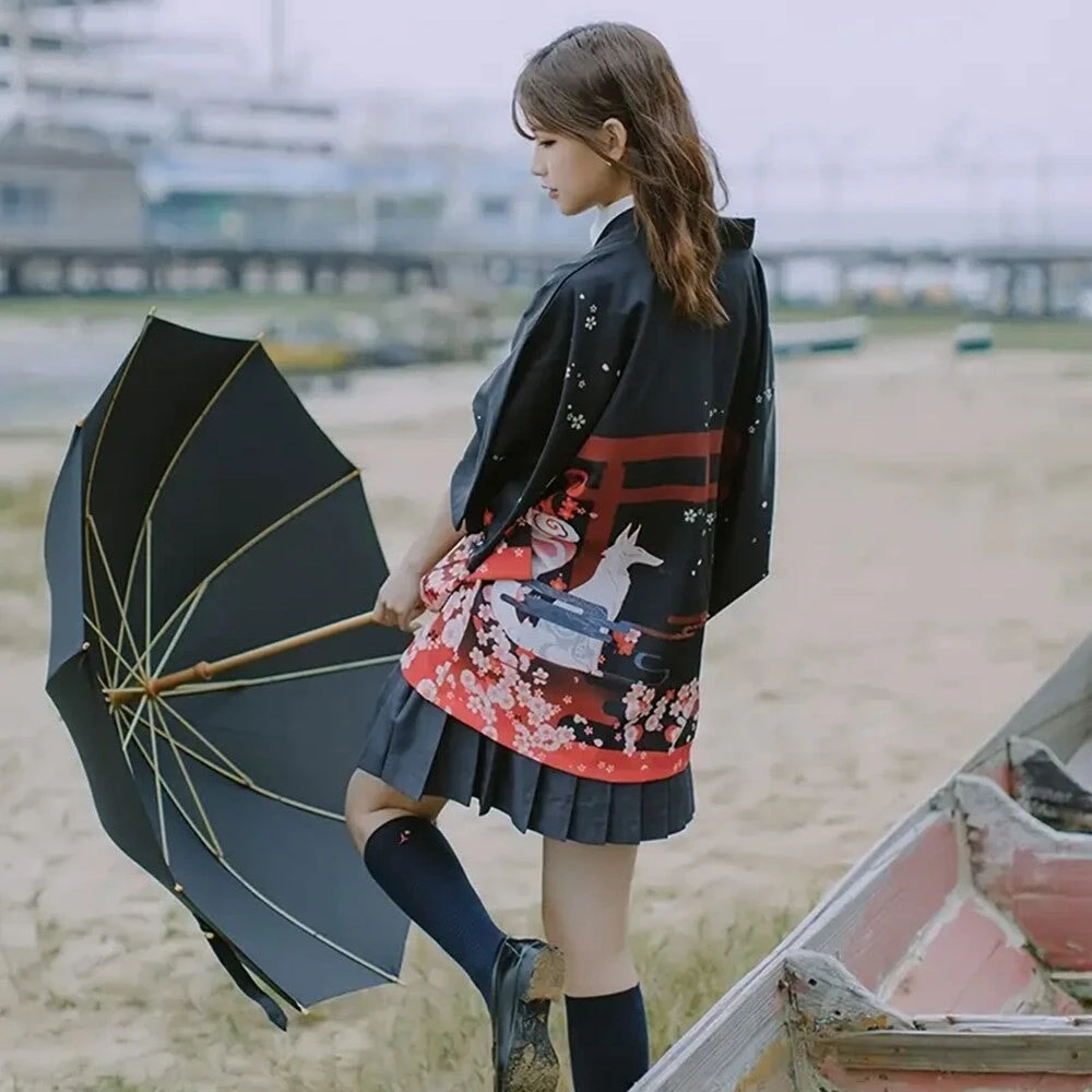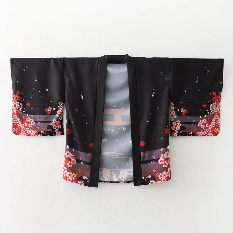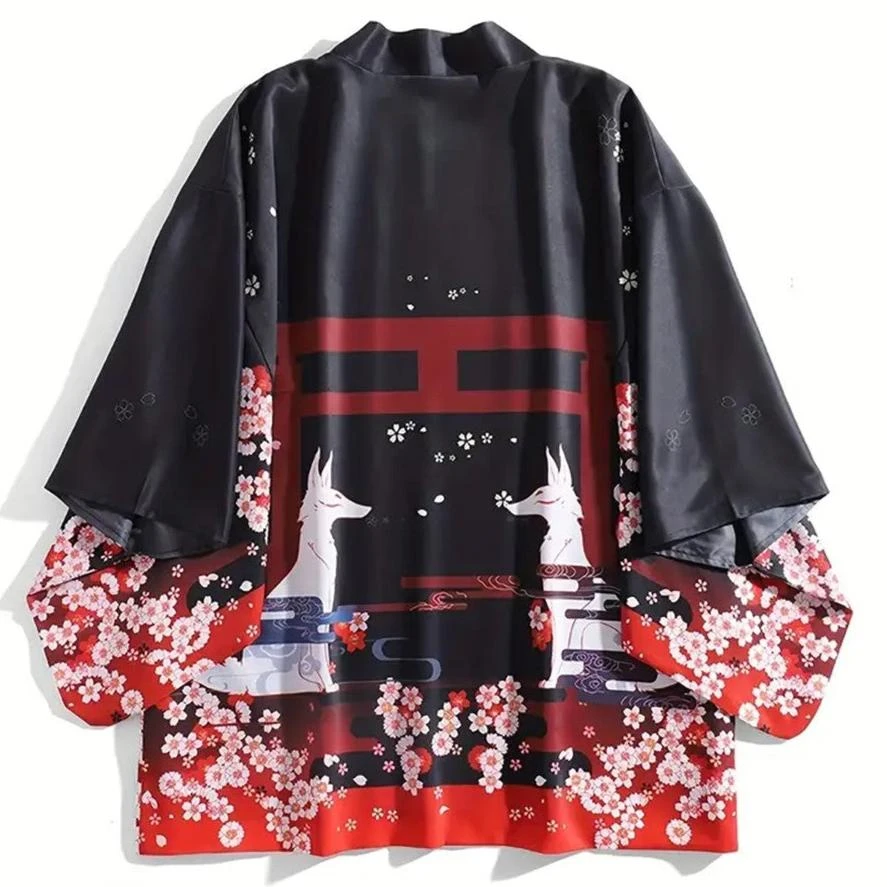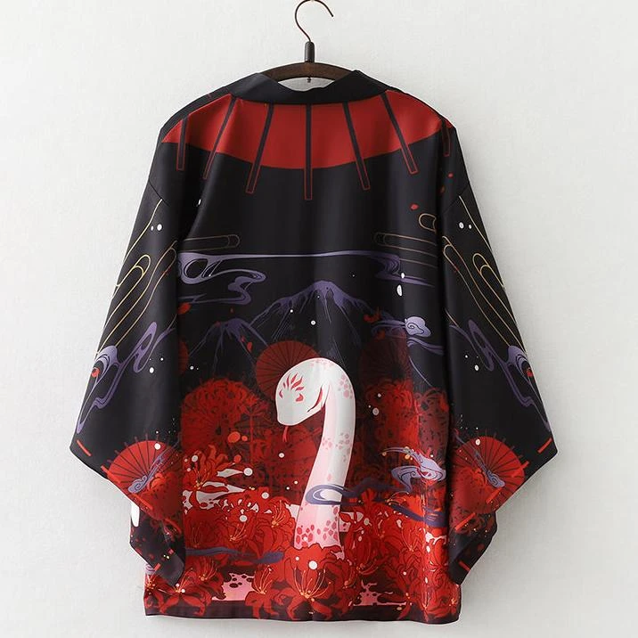 Slip into this affordable kimono, designed to feel soft and comfortable on your skin while adding a hint of Japanese flair to your wardrobe. Featuring two kimonos, each with a black canvas featuring red accents and a highly detailed illustration of shrines, cherry blossoms, smoke, and a white snake or foxes. With its classic loose fit, this kimono feels light and silky all day long.
