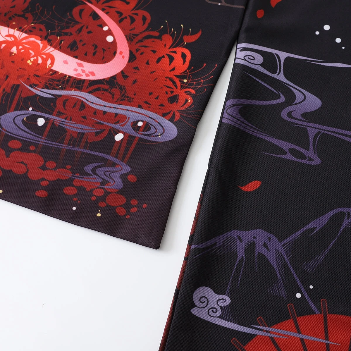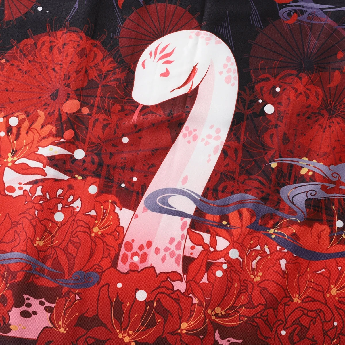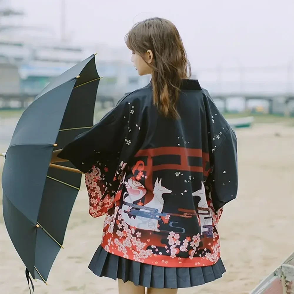 Slip into this affordable kimono, designed to feel soft and comfortable on your skin while adding a hint of Japanese flair to your wardrobe. Featuring two kimonos, each with a black canvas featuring red accents and a highly detailed illustration of shrines, cherry blossoms, smoke, and a white snake or foxes. With its classic loose fit, this kimono feels light and silky all day long.