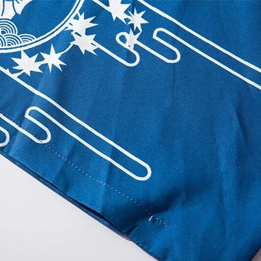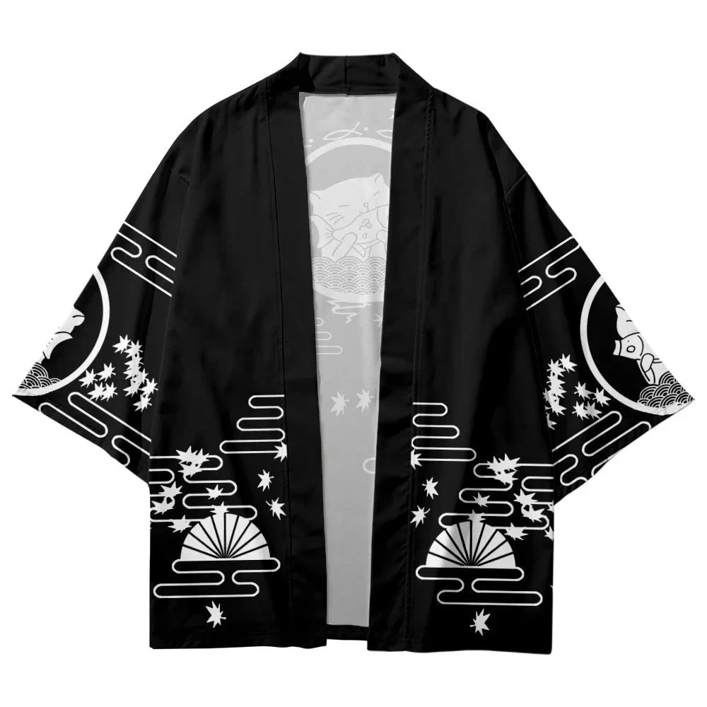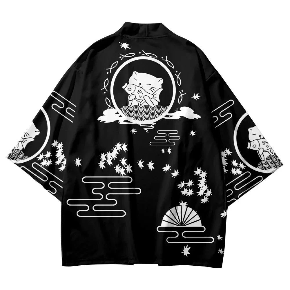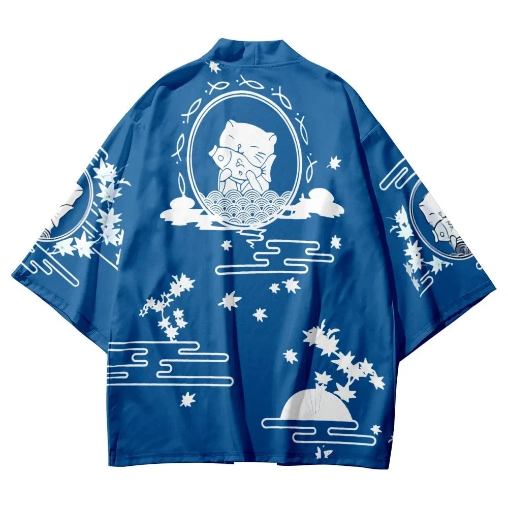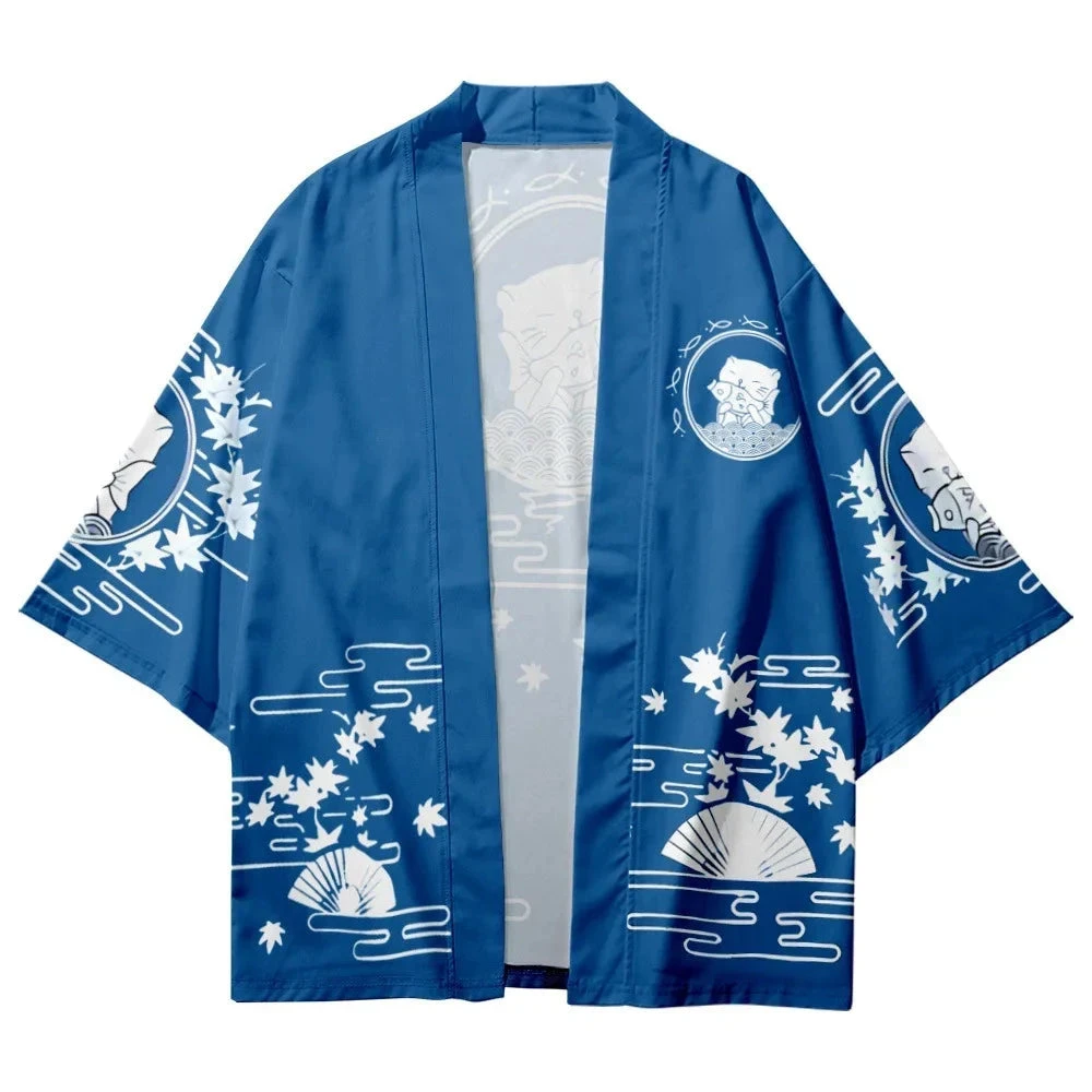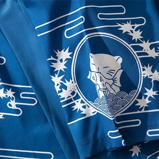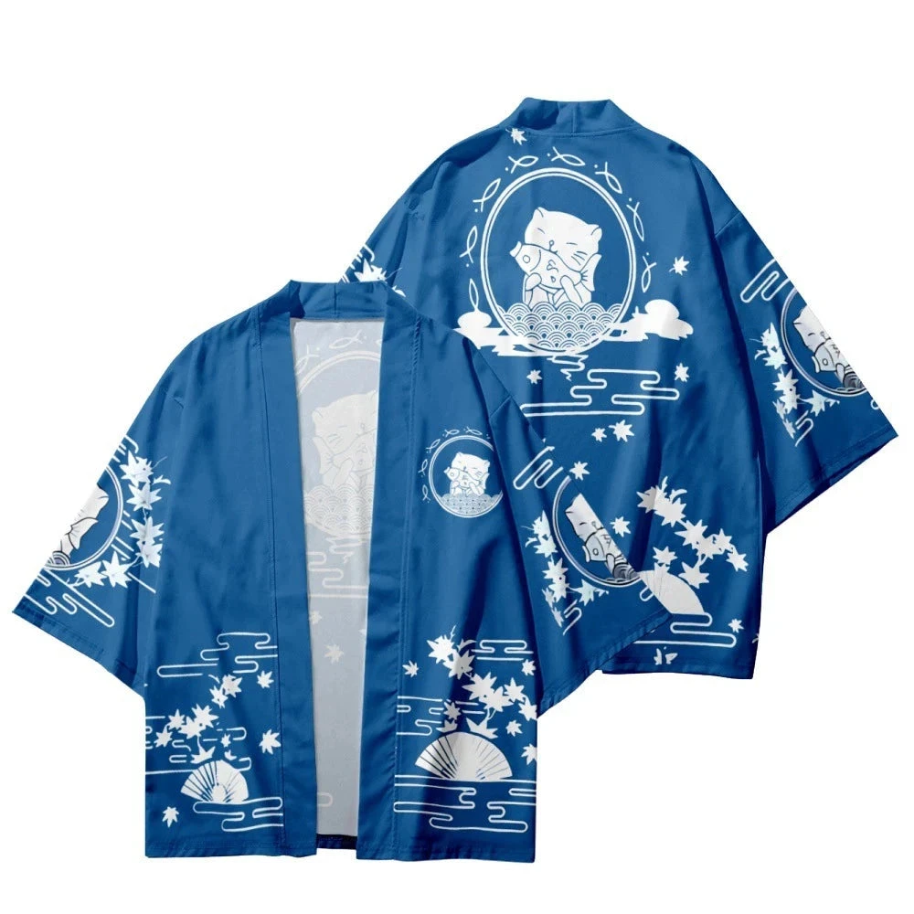 With its stunning Japanese-inspired design, this kawaii kimono features a cute cat eating a fish with illustrations all over the kimono. Available in blue and black canvases.