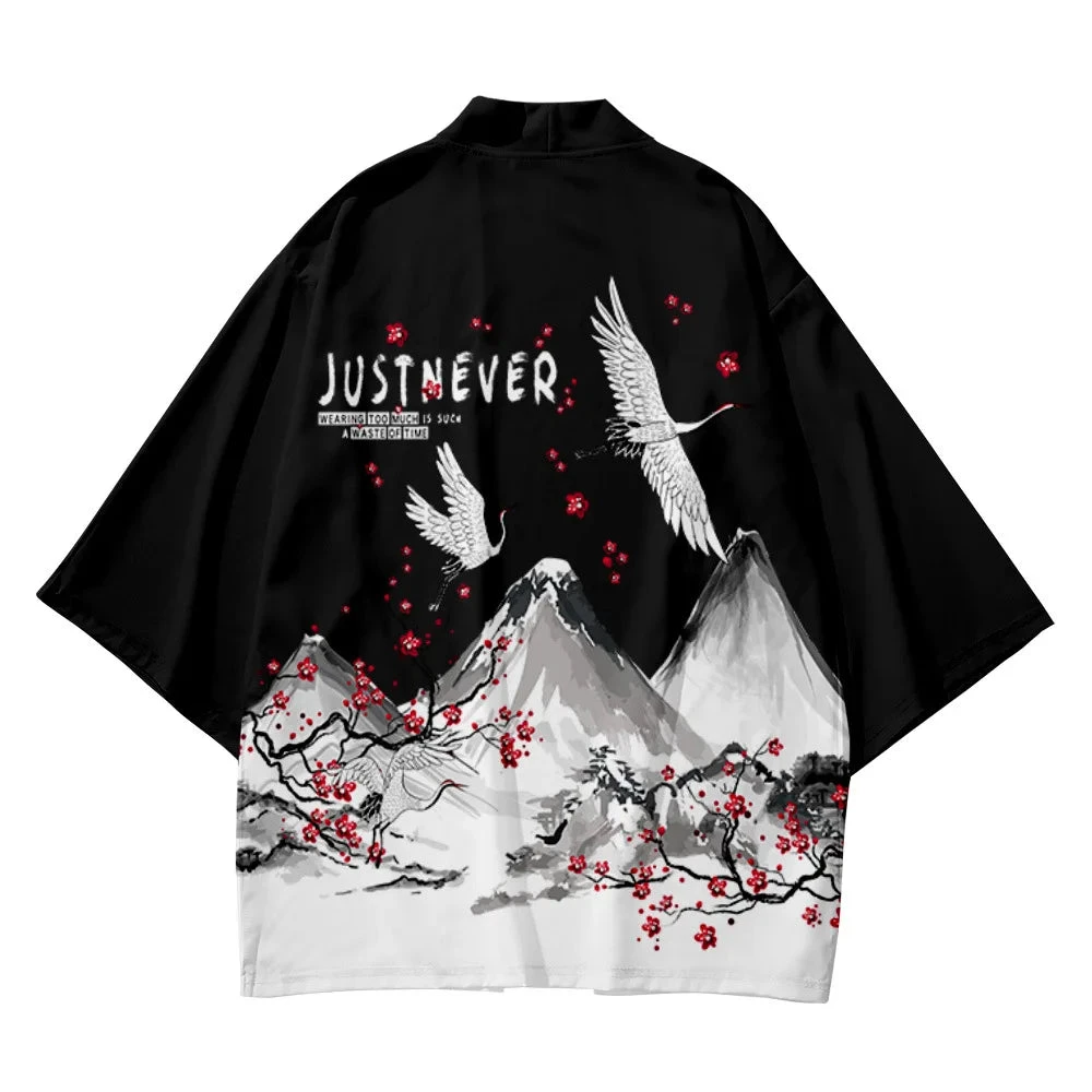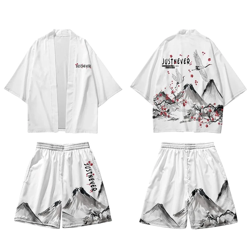 These crane-themed kimono sets are essential for anyone with a passion for Japan and a desire to immerse themselves in its culture! Featuring two graceful white cranes soaring through mountains with cherry blossom branches printed on the back of the kimono and mountains printed on the front and back of the shorts.