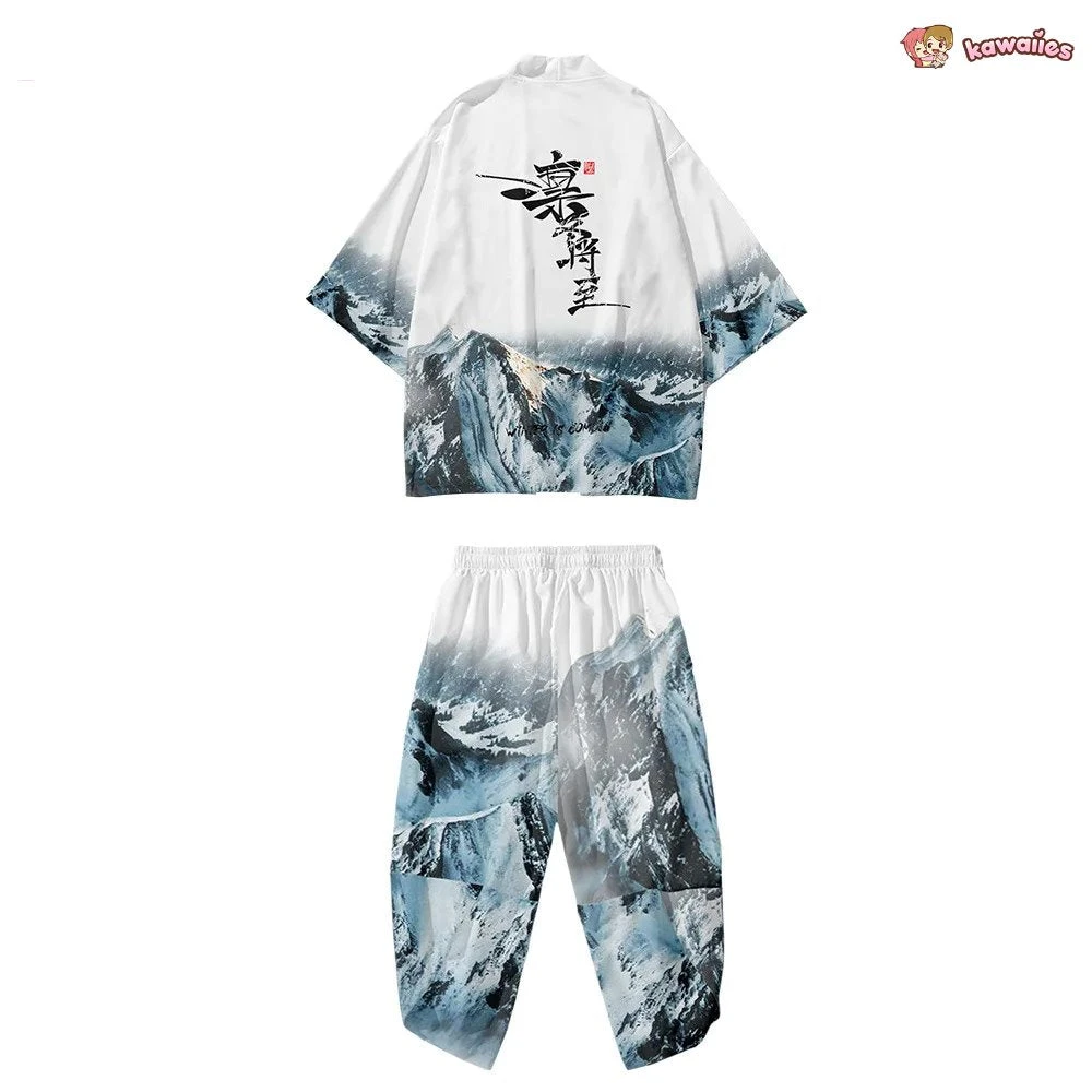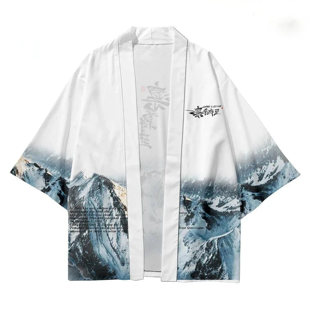 This traditional Japanese Kimono/Yukata is a must-have for anyone who loves mountains and Japanese culture. Features glacier mountains and Japanese Kanji text printed on a white canvas.