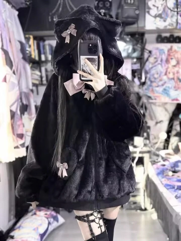 With ultra-soft faux fur, a cuddly oversized fit, and adorable details like 3D cat ears, a big pom-pom bow, and heart-shaped ribbon pockets, this jacket isn’t just warm — it’s irresistible.