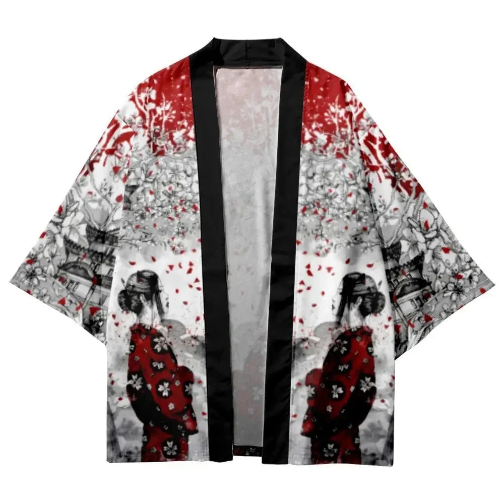 This highly detailed unisex kimono features a stunning art piece of a lady wearing a red kimono with a shrine and cherry blossom tree. This is a dream come true for those who love Japanese culture. Imagine pairing this kimono with a white tee and your favorite bottoms.Â