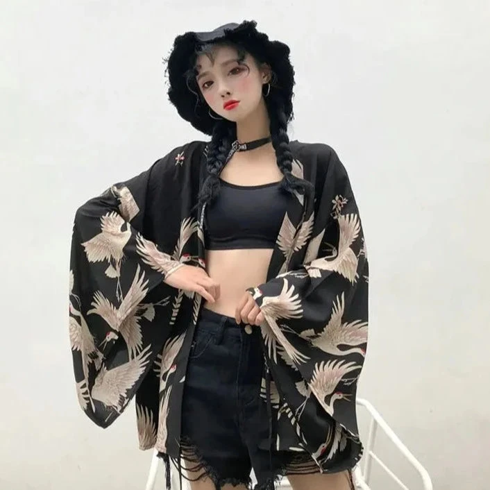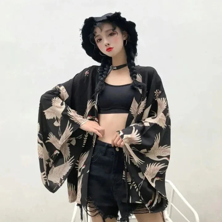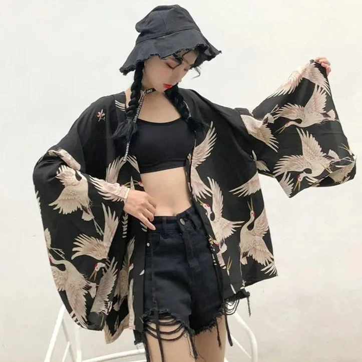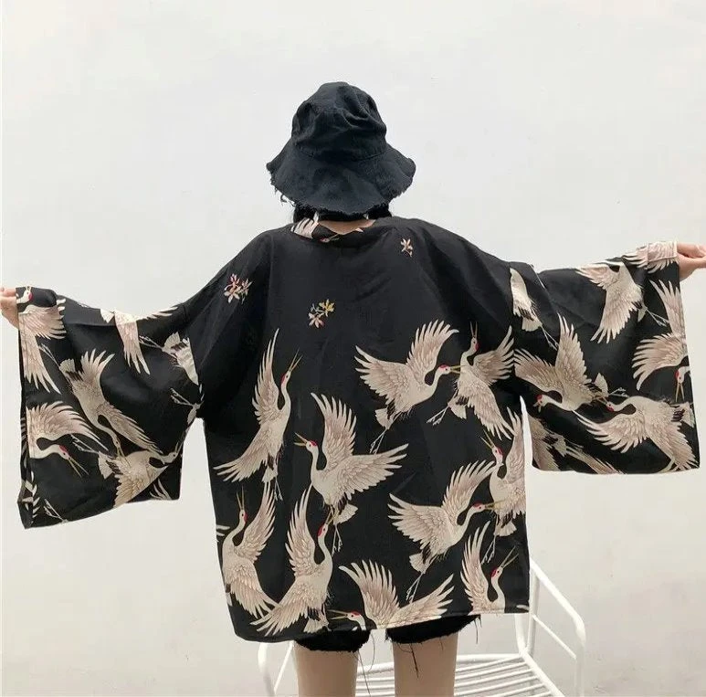 Get ready to have all eyes on you in this lightweight kimono. Featuring a flock of beautiful cranes on a black material for luck and longevity, what’s not to love about this? With a classic oversized look, this light, thin kimono will feel silky soft on your skin.
