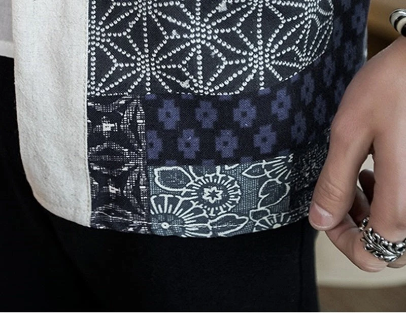 Add elegance, grace, and strength to your home with this simple but powerful statement piece kimono featuring a black or white kimono with detailed navy patterned sleeves and hem.