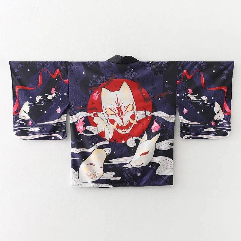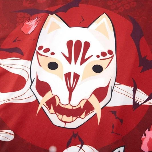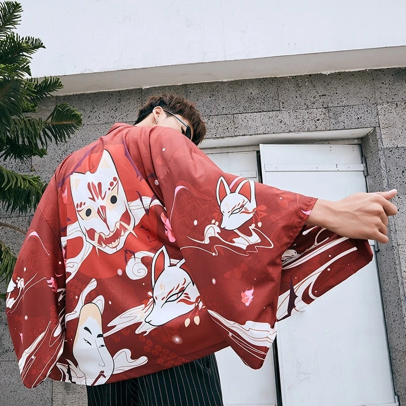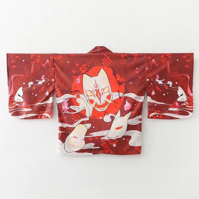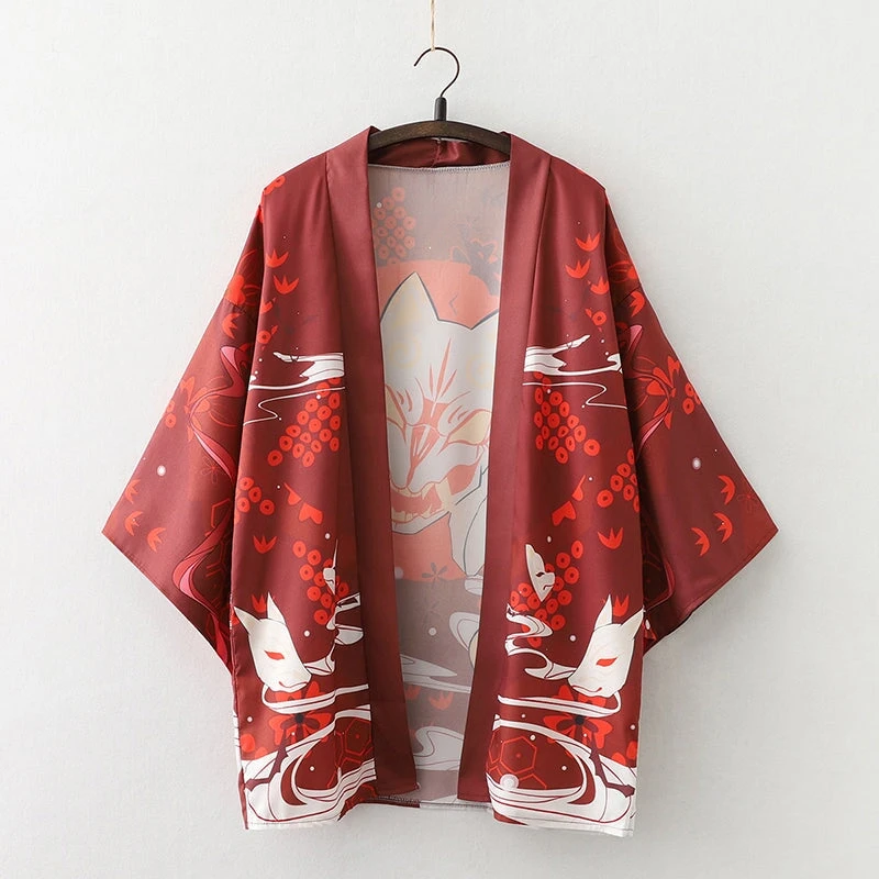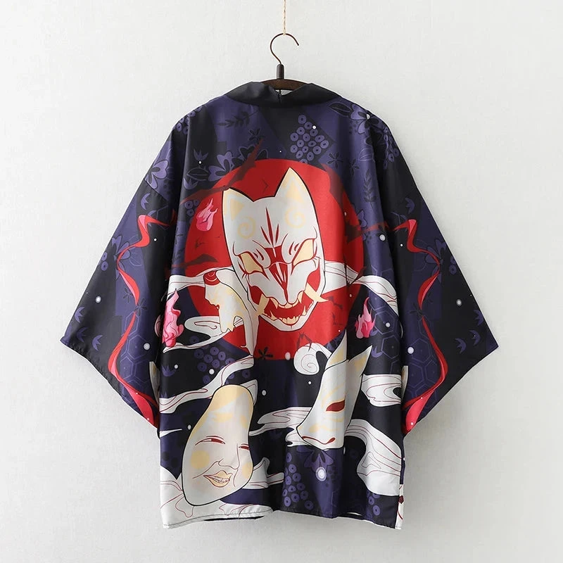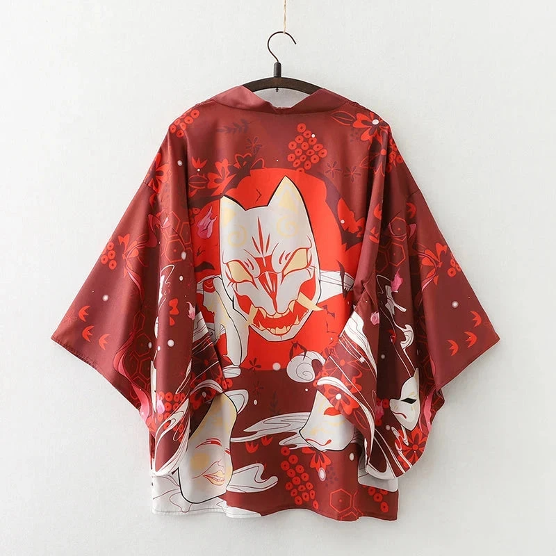 Wrap yourself in an affordable kimono that’s soft on the skin with a hint of Japanese culture. This striking red or navy kimono showcases multiple white samurai cat masks with illustrations across the canvas. Enjoy the classic loose fit that feels light and silky soft, perfect for all-day comfort.