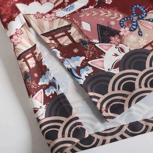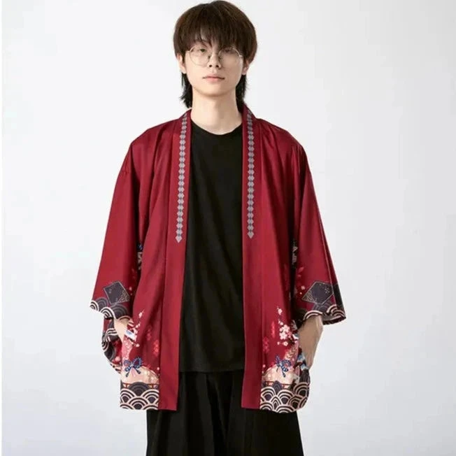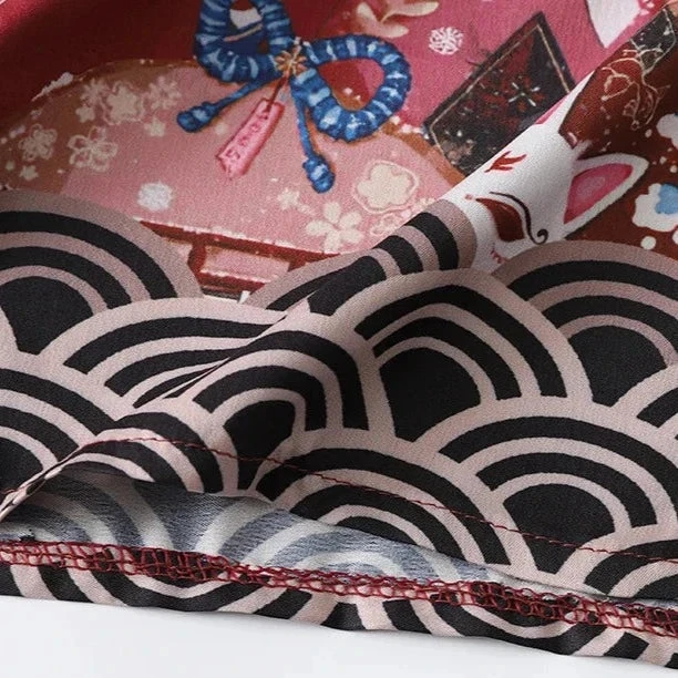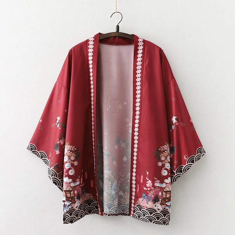 Slip into an affordable kimono that feels soft on the skin with a touch of Japanese style. Featuring a bold red canvas with a highly detailed pattern of shrines and cherry blossoms with a unique pattern around the collar. A classic loose fit that feels light and silky soft all day long.