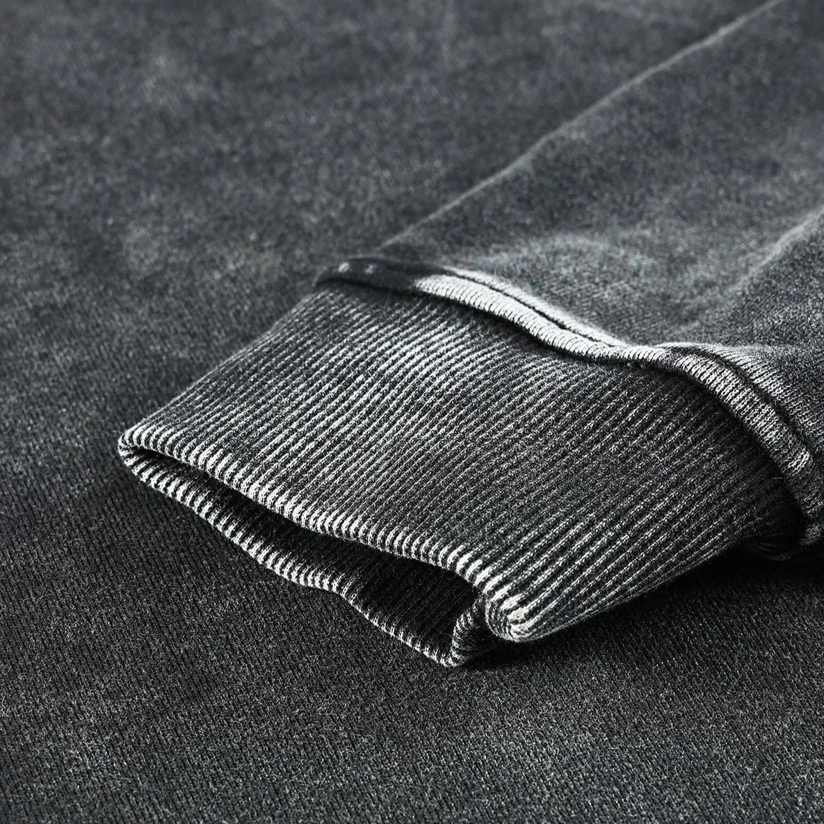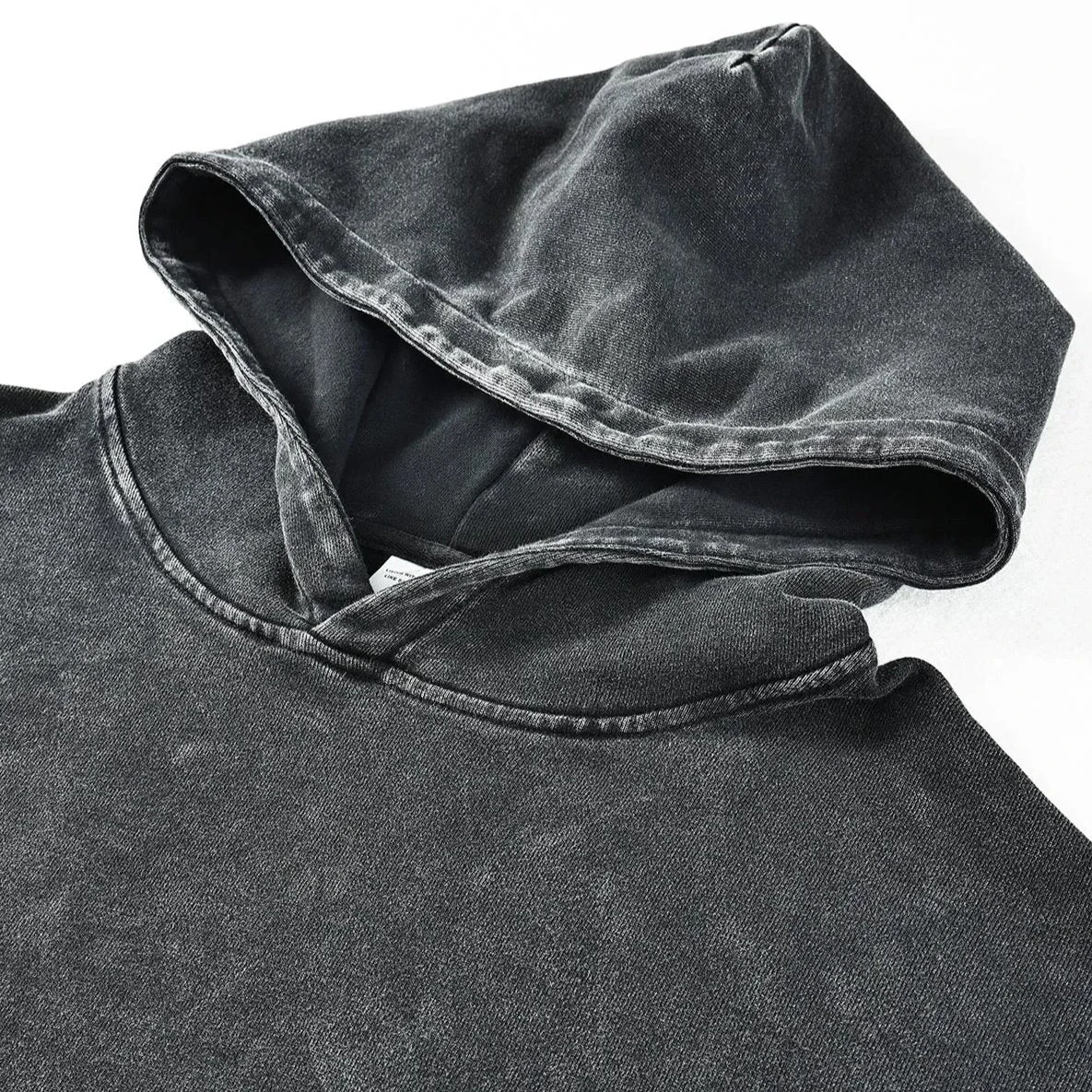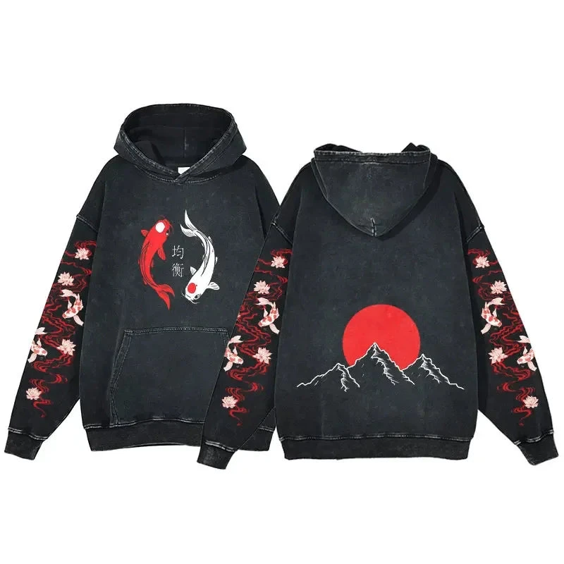 Switch up your style with a black acid-washed style hoodie featuring two koi fishes on the front and two designs of a red sun on the back with patterned sleeves.