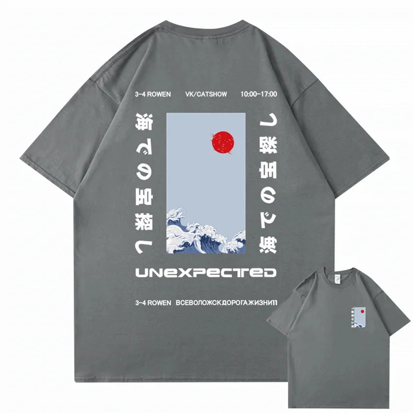 Get ready to make a splash with this one-of-a-kind tee that blends traditional Japanese culture and modern fashion. The back features a striking bold print that blends iconic Kanji characters, and powerful waves in a truly eye-catching way with a small print on the front.