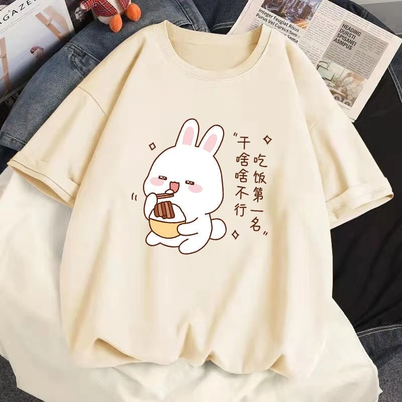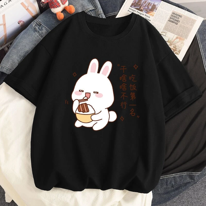 Wear your favorite animal on your tee featuring a cute white bunny munching on rice and bunny food with text. With a classic loose look, this light, thin tee is great to add some fun to your wardrobe. Each tee is sold separately.