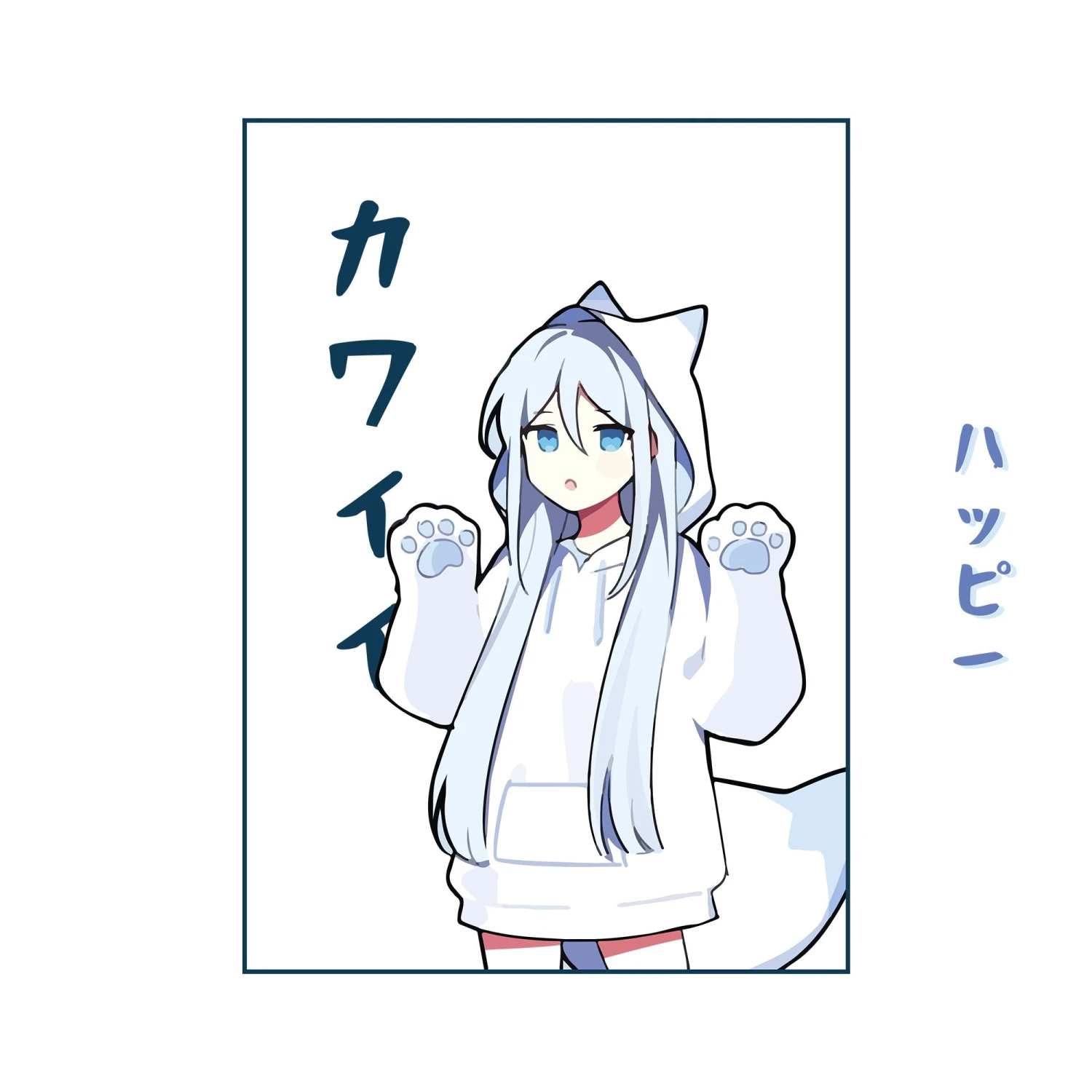 Put on your purr-fect look with this new minimal kawaii top. It’s the newest way to show off your kawaii style with a simple graphic of an anime girl wearing a white cat hoodie with blue and white hues. Made with 100% cotton fabric in a classic white t-shirt, you can be comfortable and look your best. Get your meow-velous tee now!
