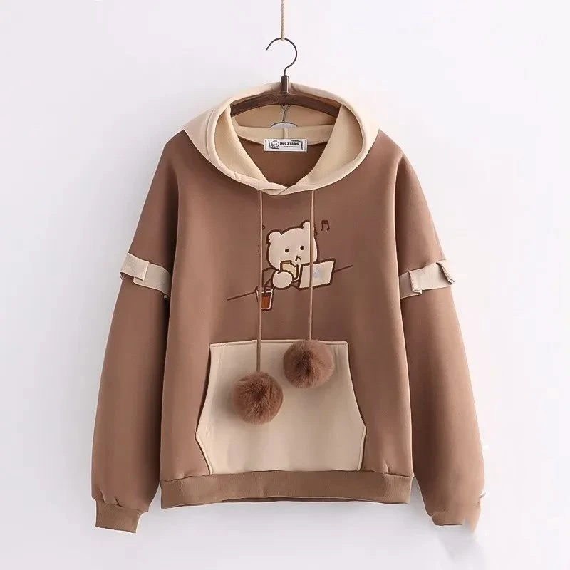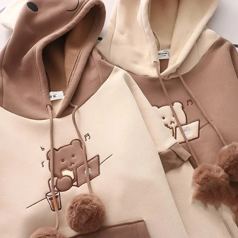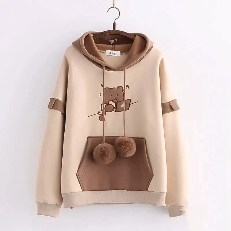 If you are looking for a bear-y cute hoodie, our Bear Hoodies are the answer. These fashionable, yet comfortable two-tone hoodies feature an embroidered cute bear working on their laptop, a bear-themed hood and fluffy pom pom tassels. Made from pure cotton fleece material that will keep you warm even in the evenings.