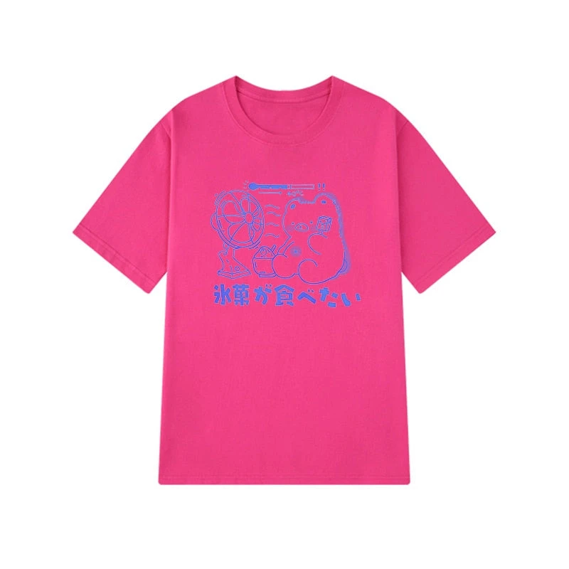 This basic tee is sure to add a touch of kawaii vibes to your wardrobe this season. Featuring a cartoon blue bear sitting in front of a fan because of how hot summer is. The look isn’t complete without a bold skirt and cute accessories for that perfect finishing touch.