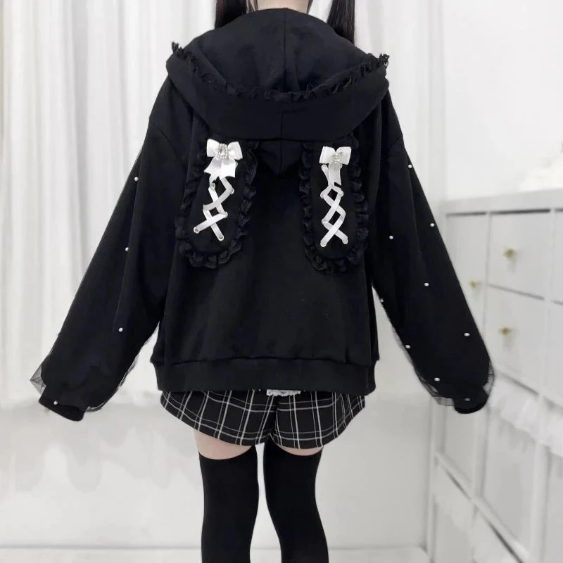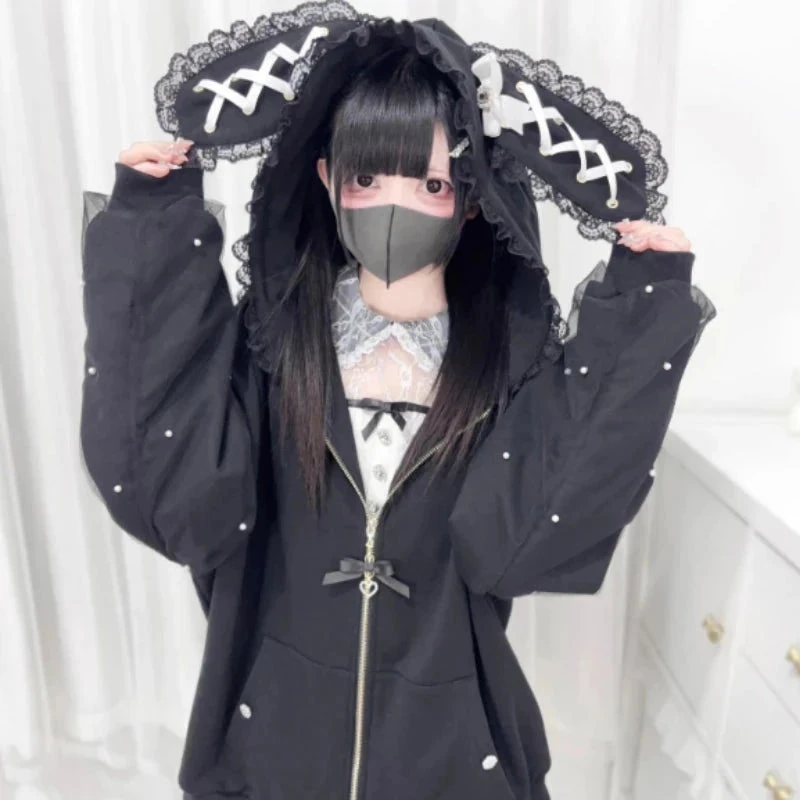 Featuring bunny ears with lace-up ribbon detail on the hood, pearl accents, and frilly trim that screams “dangerously cute.”
