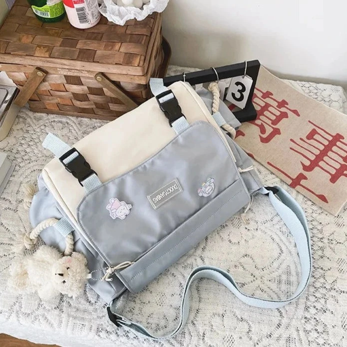 This kawaii and functional side bagfeatures several different large compartments, many pockets inside, and a couple of exterior pockets. Wear this bag on your side with adjustable straps. Buckle up to keep your main compartment safe from pick pocketers. Made from high-quality waterproof materials with enough space to fit all of your essentials. Free bear pendant included.Â