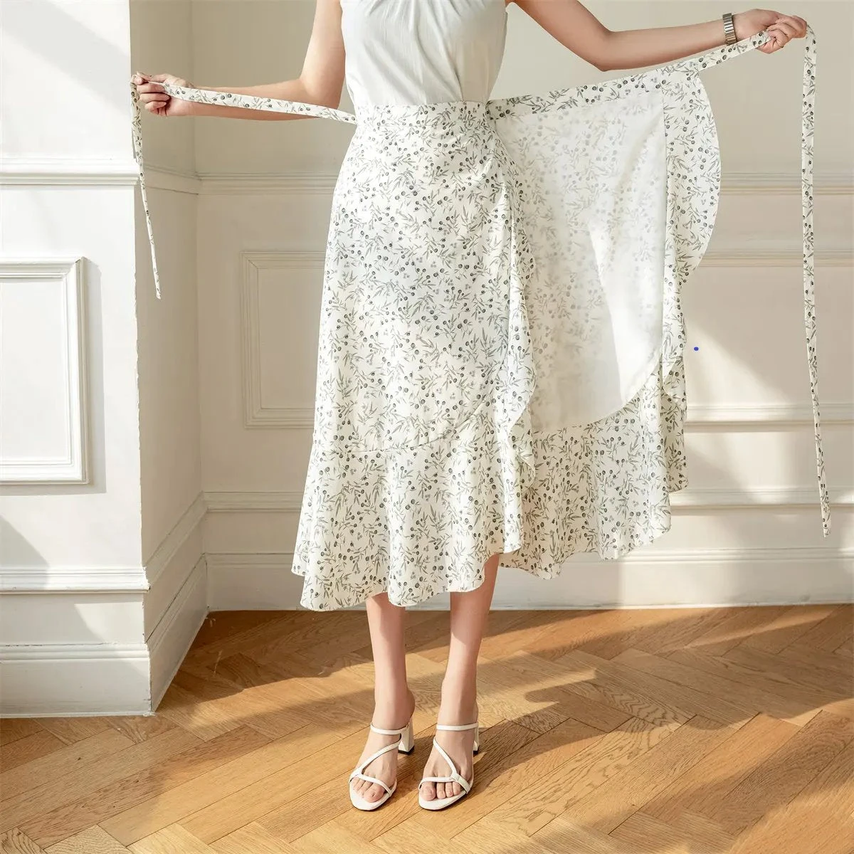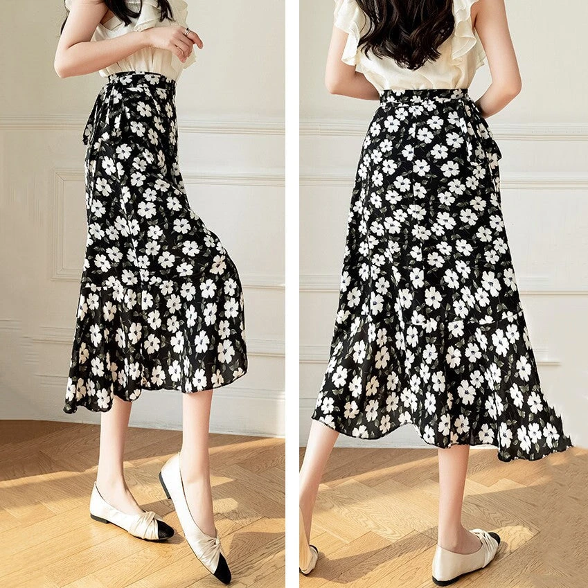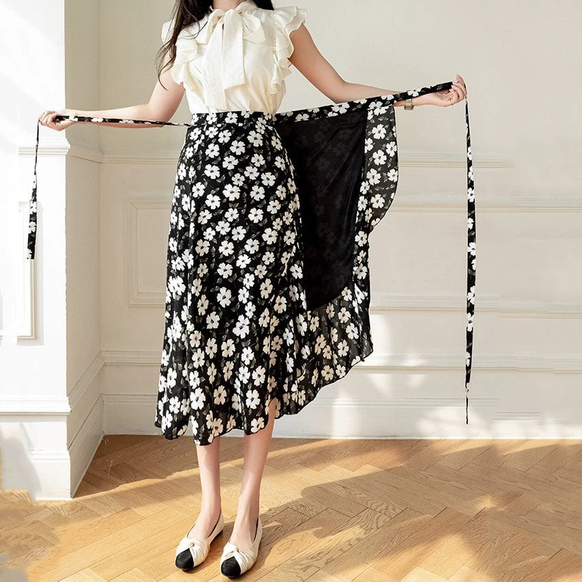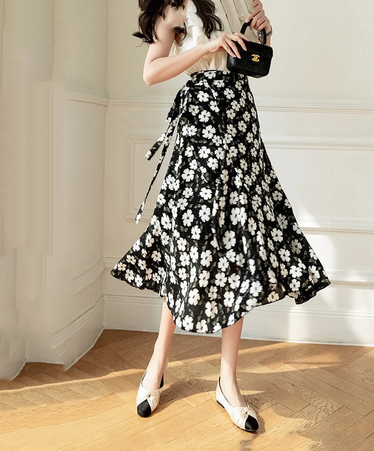 This flowing midi wrap skirt features a delicate floral print creating timeless charm, perfect for both casual outings and special occasions. The wrap design flatters every silhouette, cinching at the waist with a graceful tie that allows for a customizable fit. Crafted from lightweight, breathable fabric, it ensures comfort and ease of movement throughout the day.