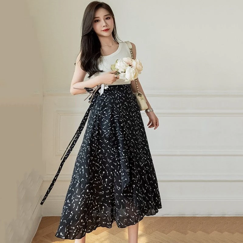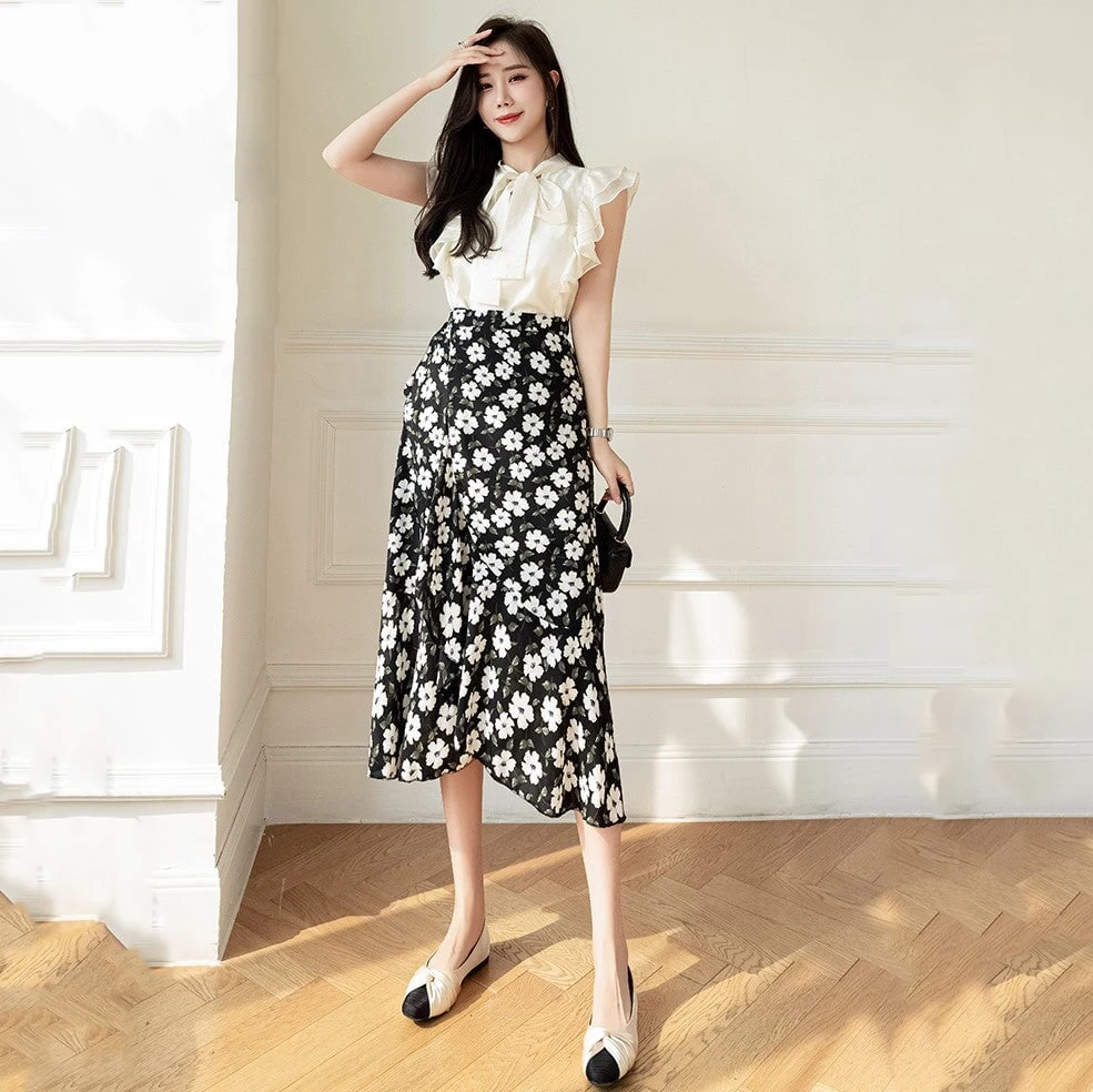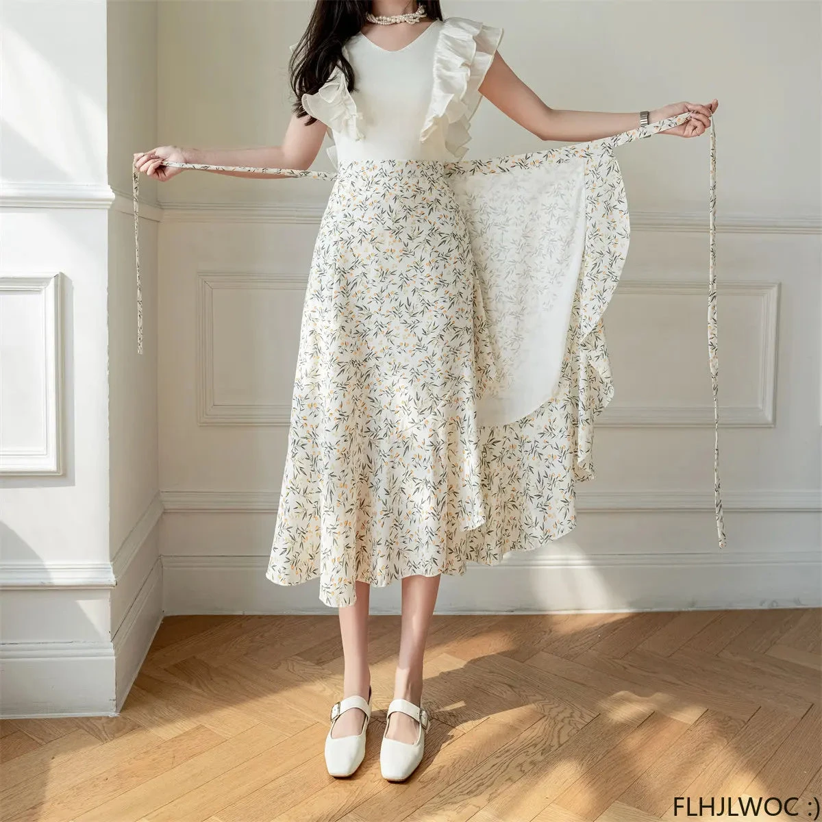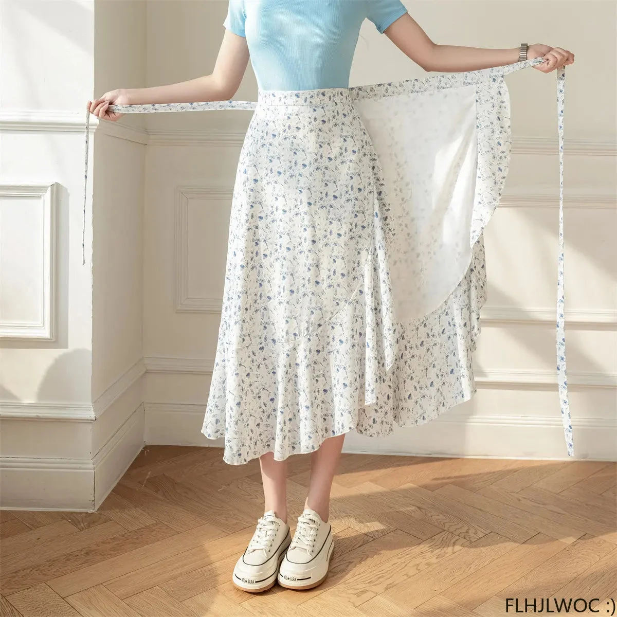 This flowing midi wrap skirt features a delicate floral print creating timeless charm, perfect for both casual outings and special occasions. The wrap design flatters every silhouette, cinching at the waist with a graceful tie that allows for a customizable fit. Crafted from lightweight, breathable fabric, it ensures comfort and ease of movement throughout the day.