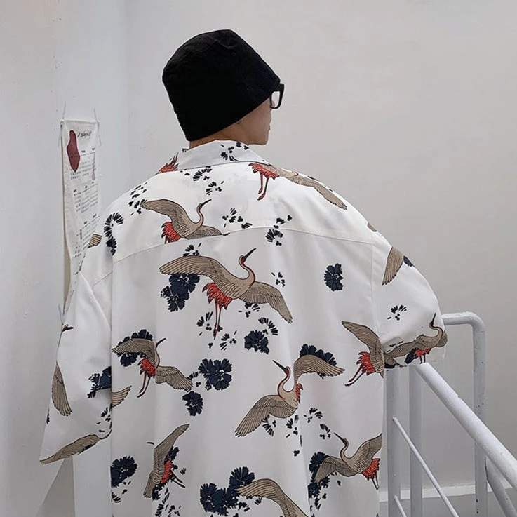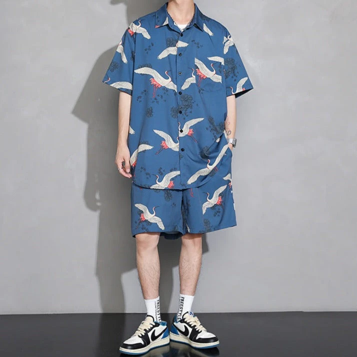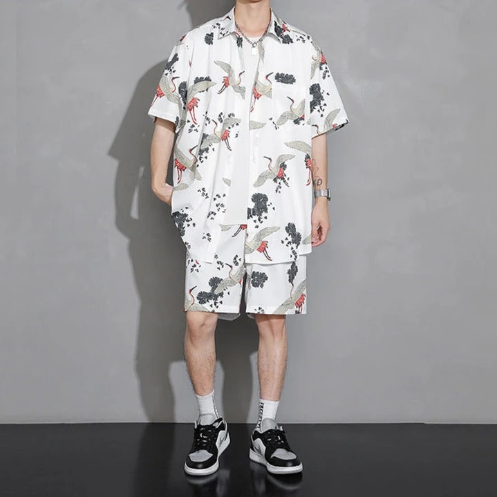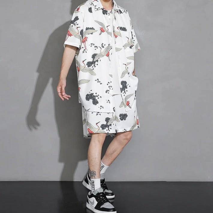 Dress up in style with this shirt and short combo featuring elegant white cranes and a floral print; available in four different colors. With a classic oversized look, this light, thin shirt is great to add a little style to your wardrobe.Â