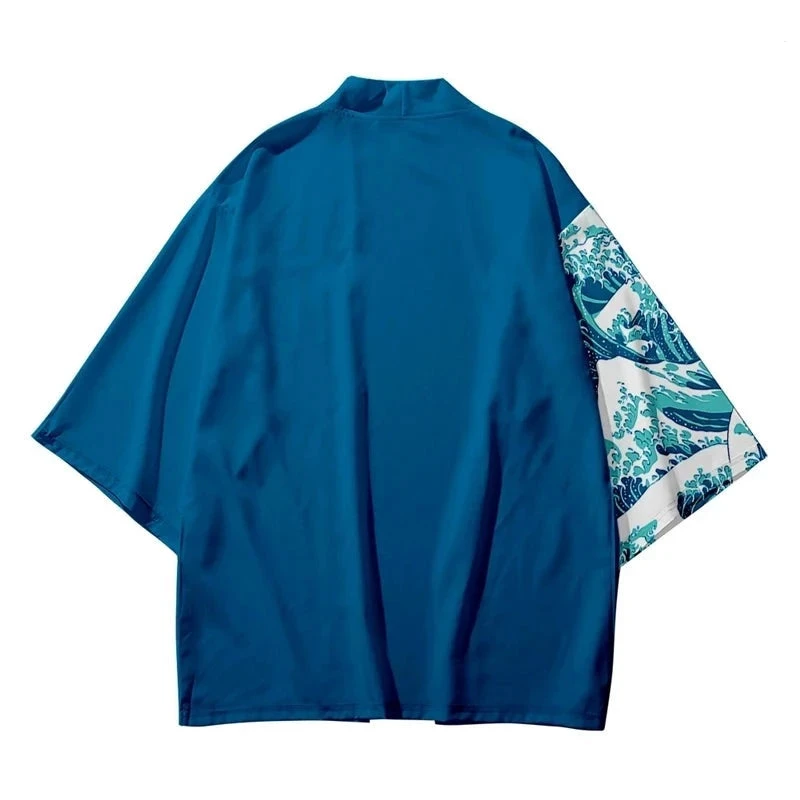 Feel the cool summer breeze in this beautiful garment, featuring the famous Kanagawa Wave design on one side of the kimono and vibrant navy blue on the other half. Feel the power of the ocean and feel stylish in this classic fit Japanese Kanagawa Wave Unisex Kimono.