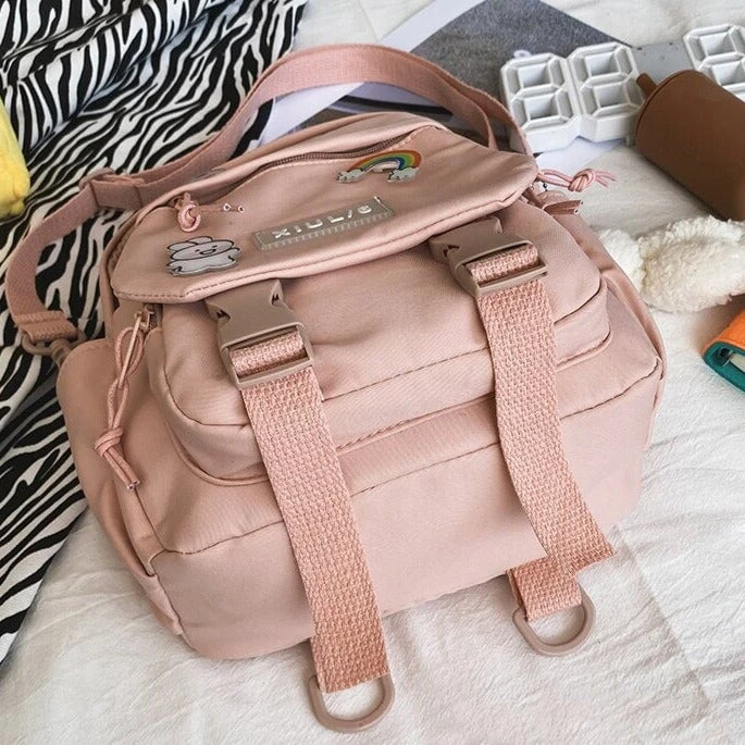 Your search for the perfect bag is over. This small backpack is roomy, durable, lightweight, and can be worn on your back or on your side. It features several different pockets inside and outside, buckle straps, and cute accessories. The front of the bag also features a pocket where you can keep things safe with two buckles and a zipper.