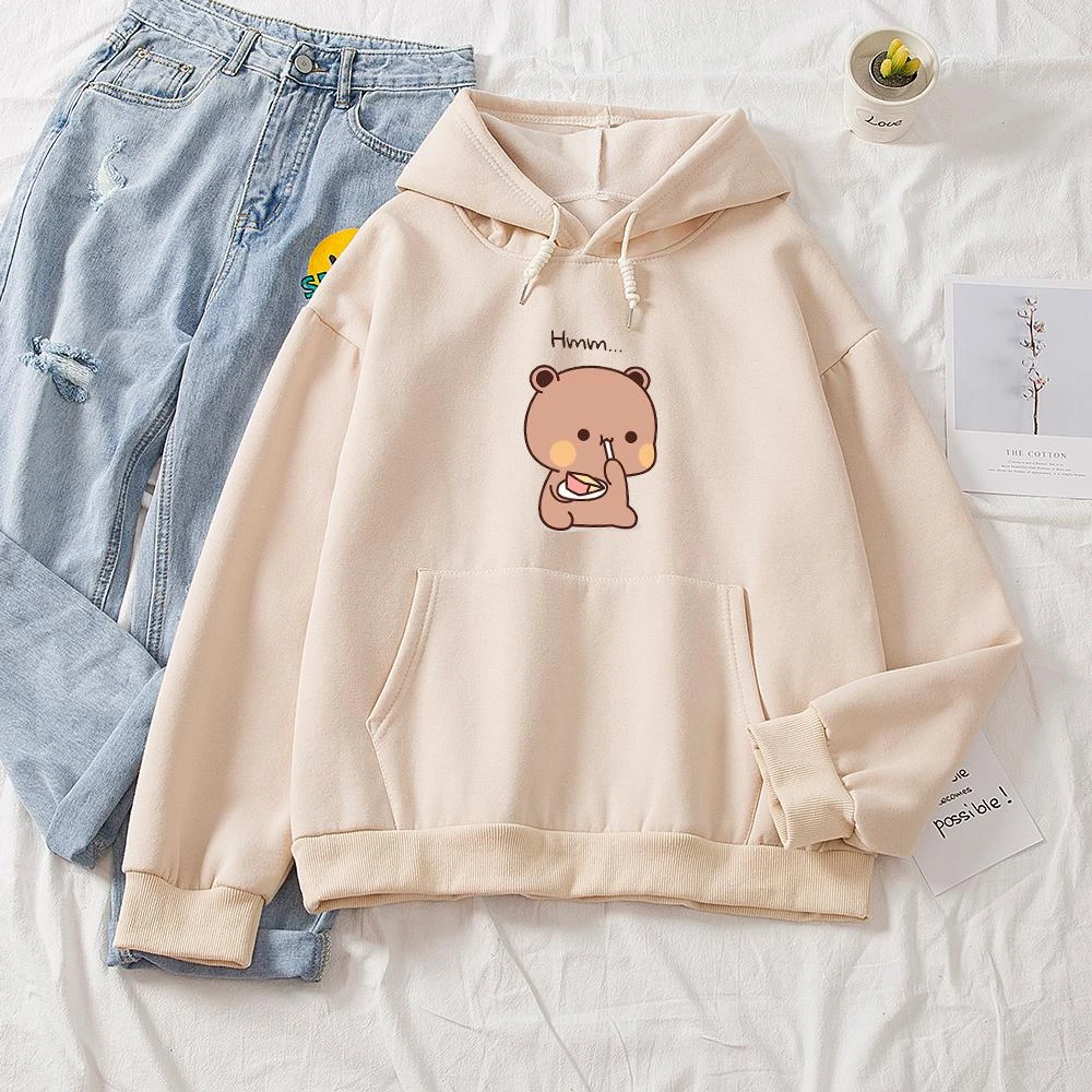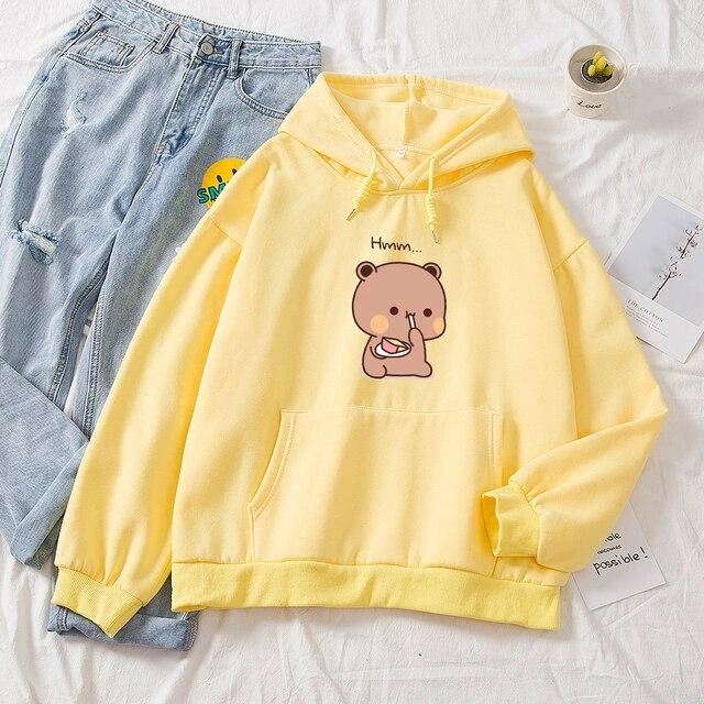 Add some comfort and sweetness to your look with this hoodie. Featuring a chocolate brown bear snacking on a cake thinking about what to snack on next. Style this with any bottoms and fresh kicks to complete the look.