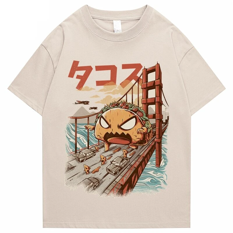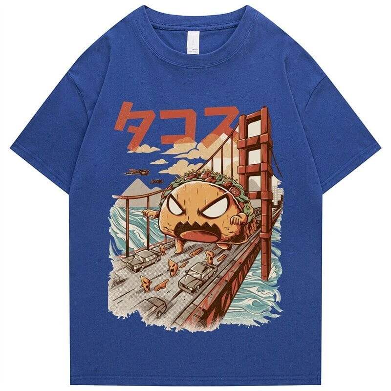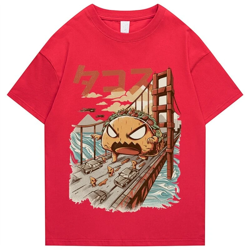 Deck out in this Taco Monster Tee and get ready to cause some mayhem! Defend yourself from the Taco Monster with this unforgettable tee! Perfect for fans of tacos ior monsters, this tee features a design of a giant Japanese taco crossing a bridge and treading on cars! Get one today and show the world your “monster-ous” style!