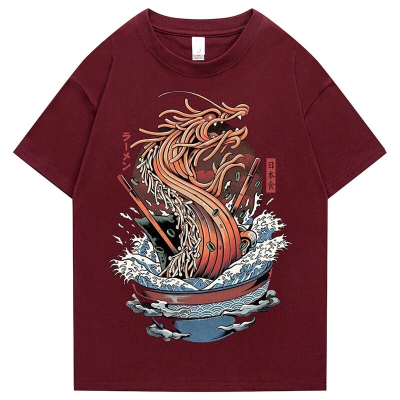 Featuring a dragon made from noodles roaring within a ramen bowl, amidst intricate waves that evoke a sense of strength and power. Crafted from premium cotton, this t-shirt ensures a sleek fit that’s both comfortable and confidence-boosting.