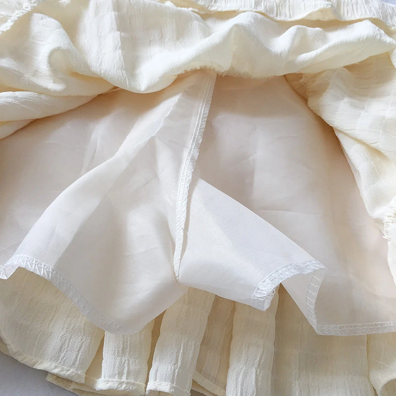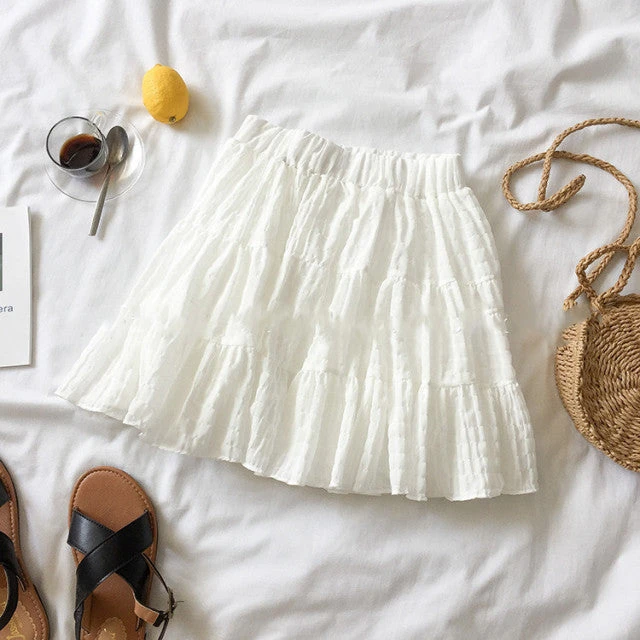 This short simple skirt is perfect for the warmer weather. Featuring a white or beige lightweight polyester blend material and a simple but easy-to-match look. Effortlessly wear this skirt with a cute tee and knee-high socks for the perfect weekend fit.