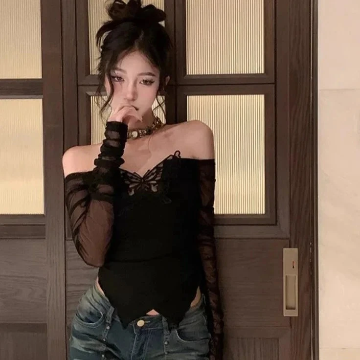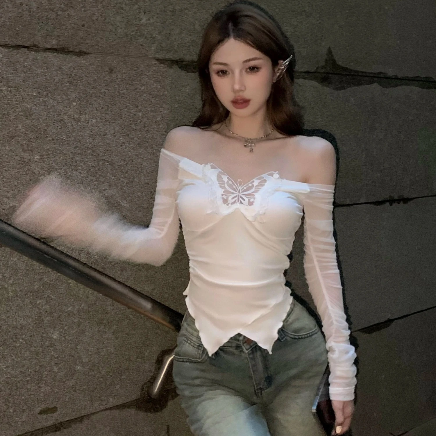 Add this to your weekend fit featuring mesh like sleeves, a lace butterfly on the front and an off-shoulder long-sleeve design. Enjoy wearing this top when you’re out with friends! Pair it effortlessly with jeans and fresh kicks.