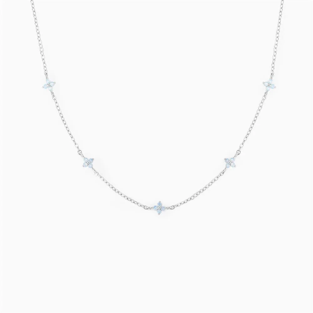 Whether you choose the station necklace, featuring a gentle trail of petite blossoms, or the pendant version with a radiant blue flower halo, this piece captures the essence of springtime serenity all year long.