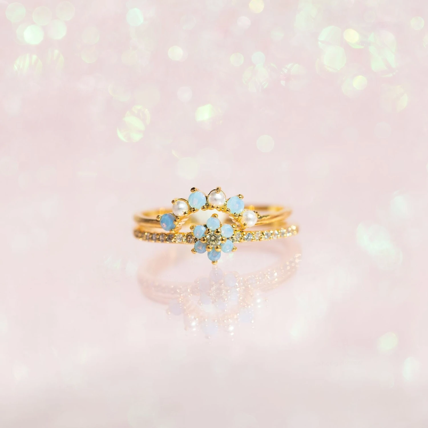 A pair of exquisite and elegant rings that will make you feel like royalty. These rings feature a beautiful blue flower design with small gems along the band and a beaded ring that goes perfectly together.
