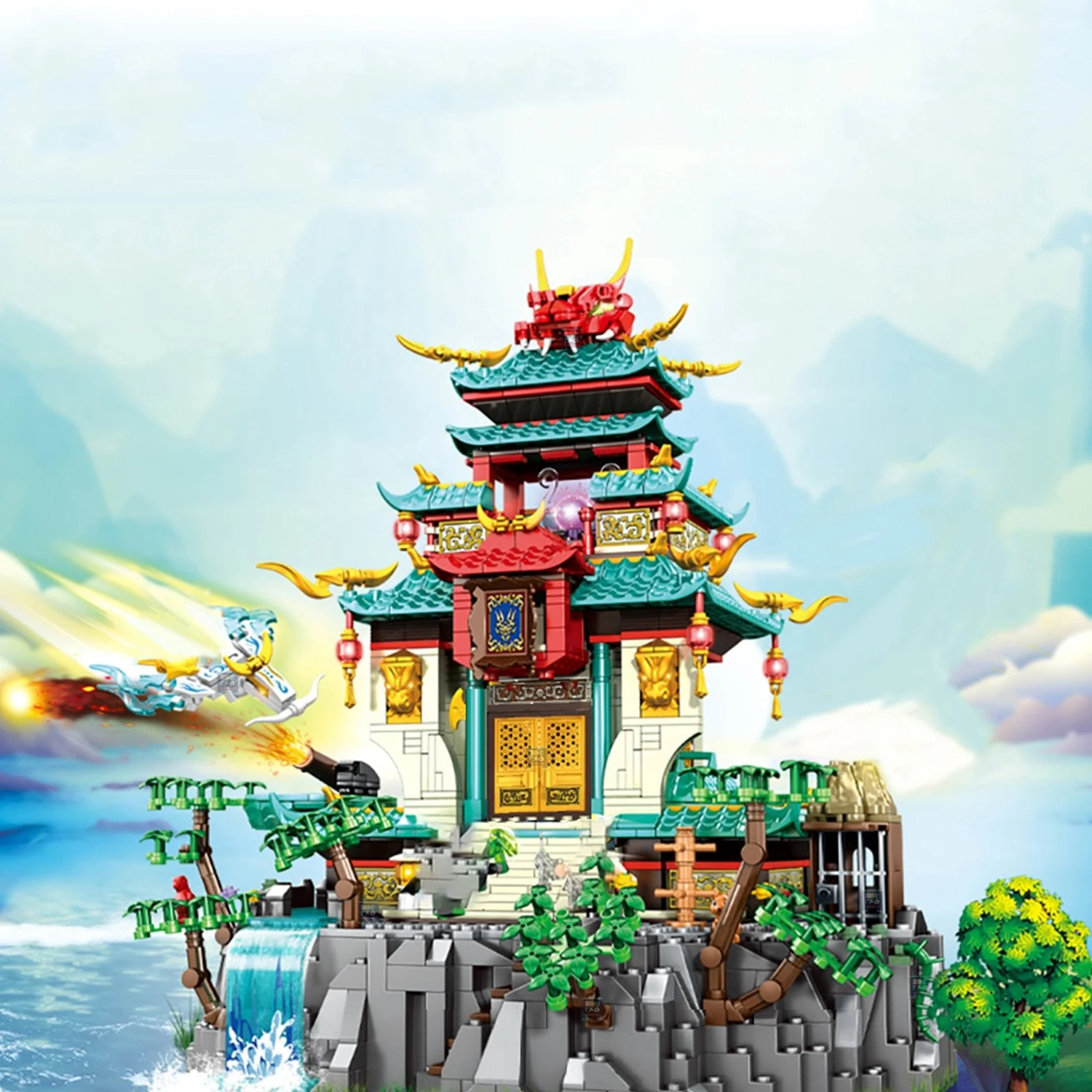 Why not take on this challenge and put together 1700+ pieces to build yourself the most amazing dragon palace ever? Featuring a palace sitting on a mountain with turquoise roof tiles, gold and red accents, dragon-themed details, and a waterfall.