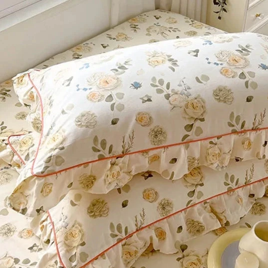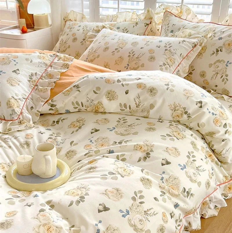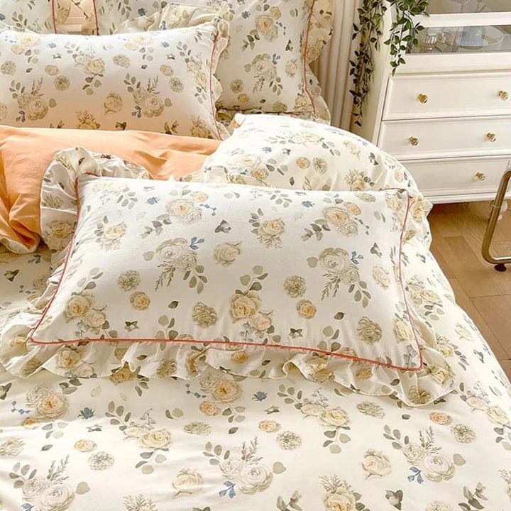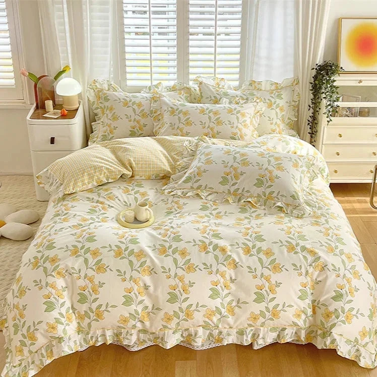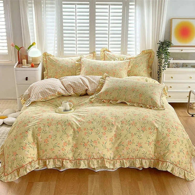 Made from 100% premium cotton (200gsm), these bedding sets feel incredibly soft, breathable, and durable. Designed with delicate ruffles and a charming floral yellow/orange aesthetic, it adds a natural touch to your bedroom. Plus, with its reversible print, you can switch up your style anytime!